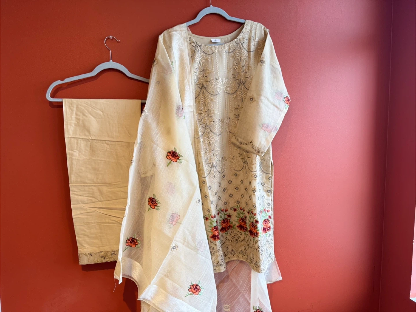 Selling a beautiful salwar kameez suit with intricate embroidery. The set includes the kameez (top), salwar (pants), and a matching dupatta (scarf). The fabric is a light, airy material, perfect for warmer weather. Features lovely floral embroidery details
