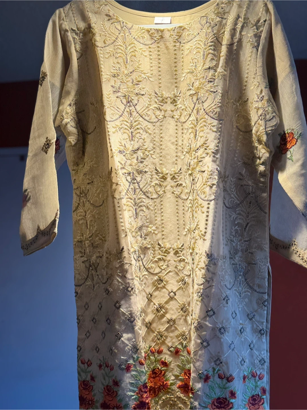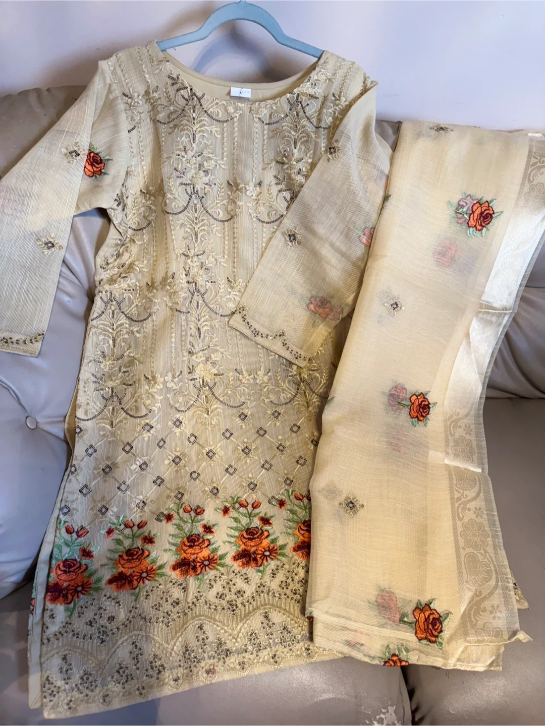 Selling a beautiful salwar kameez suit with intricate embroidery. The set includes the kameez (top), salwar (pants), and a matching dupatta (scarf). The fabric is a light, airy material, perfect for warmer weather. Features lovely floral embroidery details