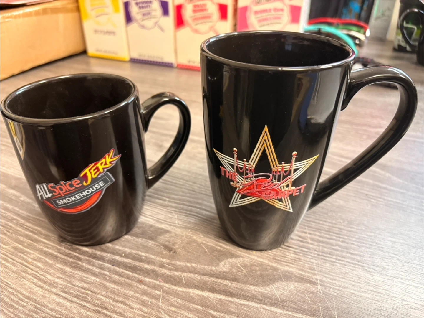 Two black mugs, one branded 'All Spice Jerk Smokehouse' and the other 'The Red Carpet'.