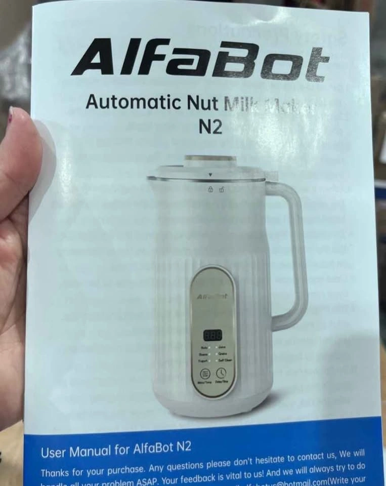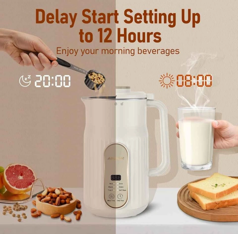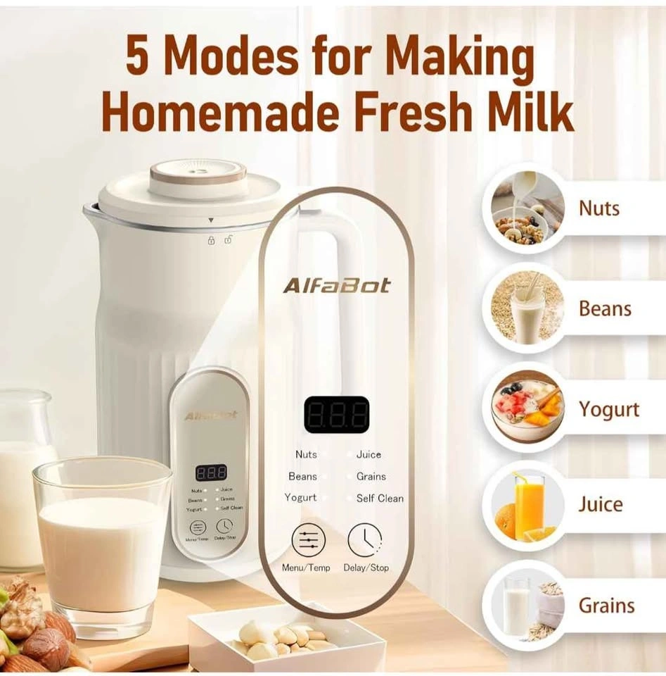 AlfaBot N2 Automatic Almond Milk Machine for Homemade Plant-Based Milk, Oat, Soy, Yogurt and Dairy Free Beverages, 35 OZ Soy Milk Maker with Delay Setting and Self Cleaning. Enjoy fresh, delicious nut milk that's free from preservatives, additives, and any other unwanted ingredients. It's the perfect way to create healthy and sustainable plant-based milk that's good for you and the environment. The nut milk maker machine is versatile and can be used to make a variety of plant-based milks, including almond milk, cashew milk, coconut milk, multigrain milk and more. There are 5 basic modes for meeting your needs: Nut, Beans, Yogurt, Juice and Grains. It's a mixer with blending and boiling function.