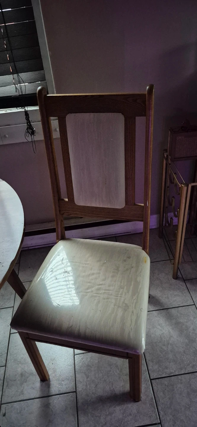 Set of wooden dining chairs featuring upholstered seats and backrests. The wood has a natural grain finish. These chairs are sturdy and comfortable for everyday use. Perfect for a dining room or kitchen table.
