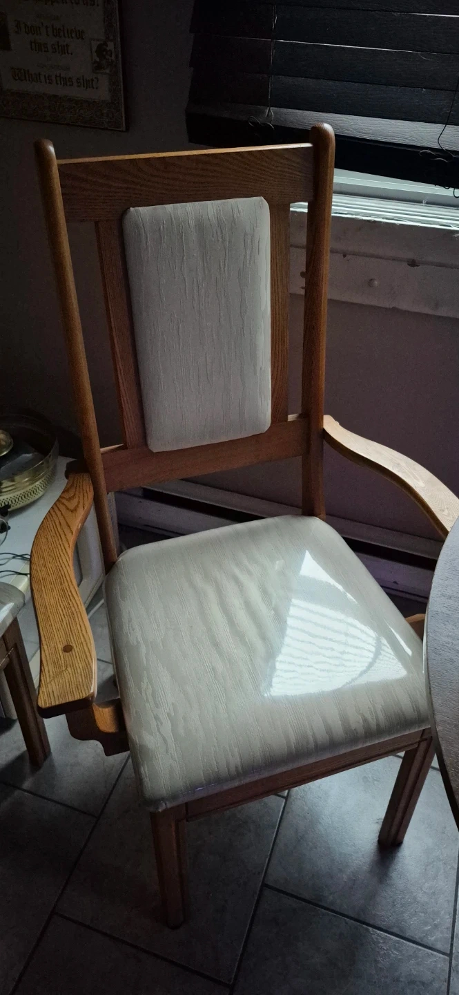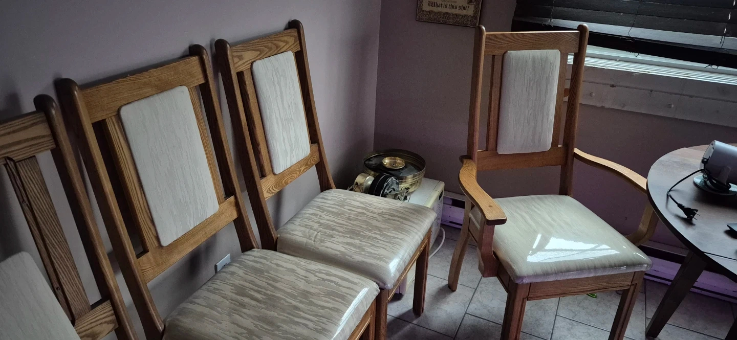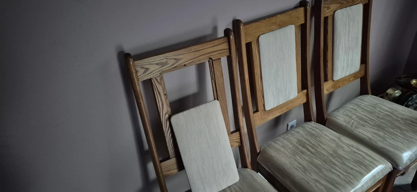 Set of wooden dining chairs featuring upholstered seats and backrests. The wood has a natural grain finish. These chairs are sturdy and comfortable for everyday use. Perfect for a dining room or kitchen table.