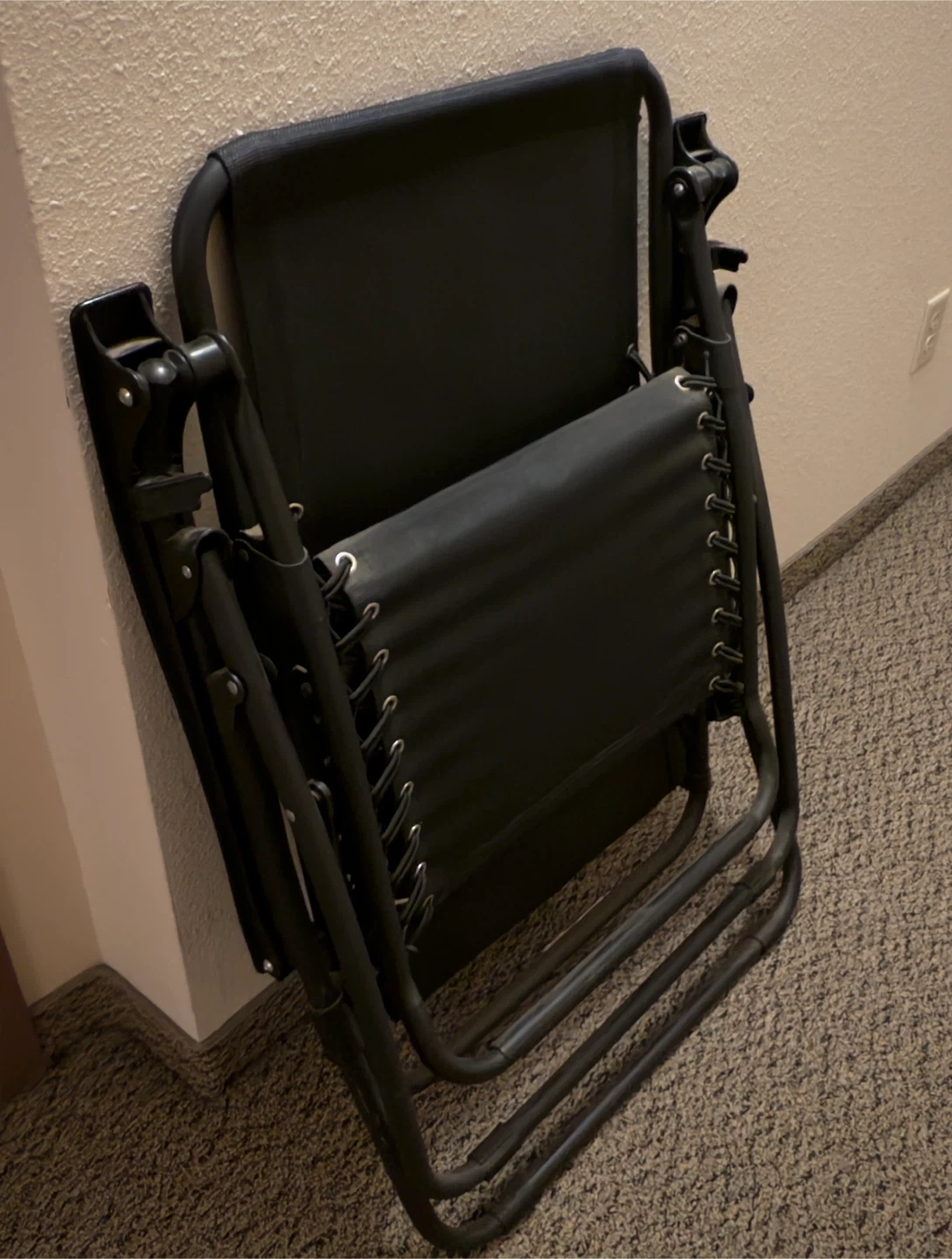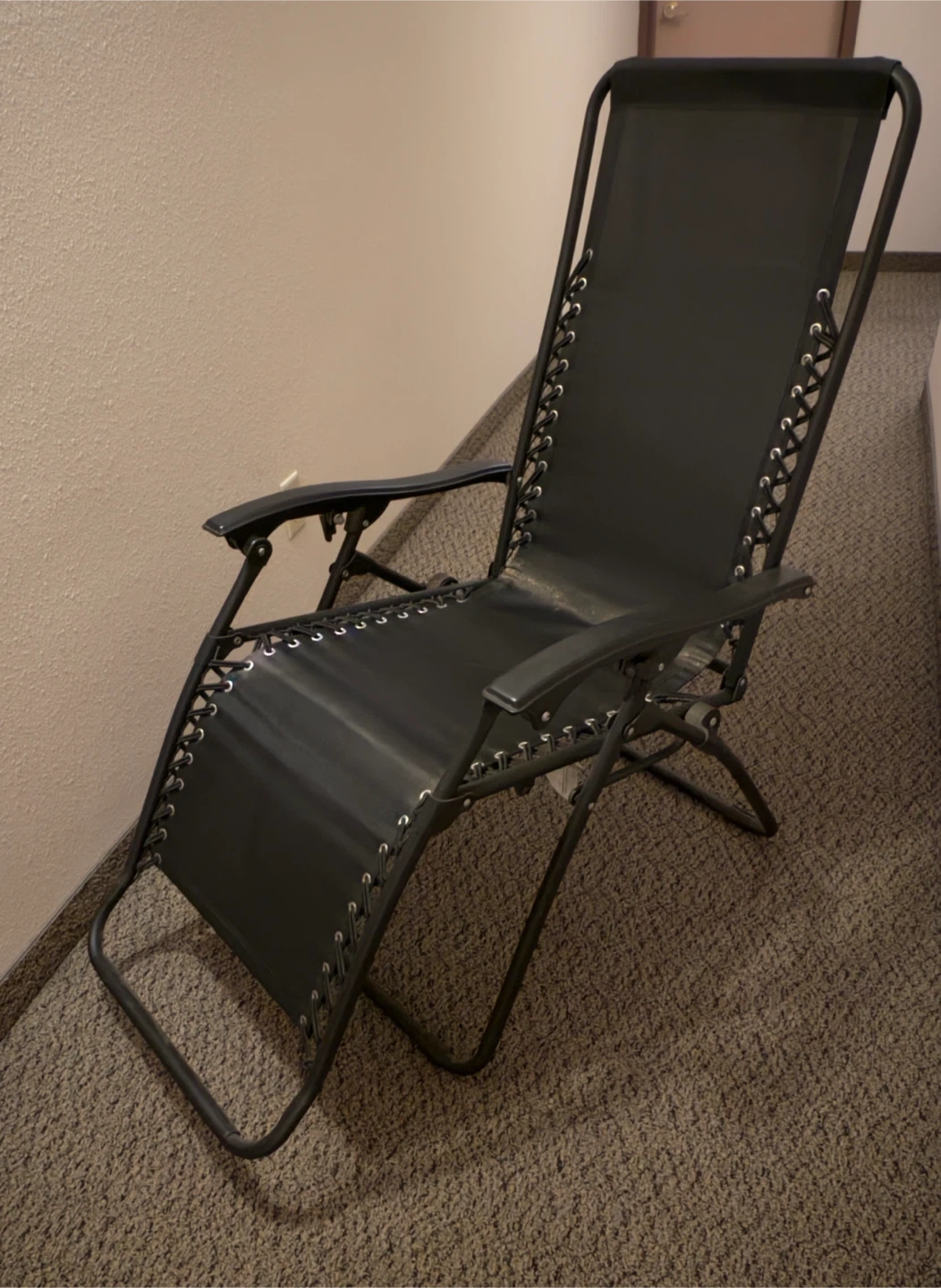 This black zero gravity chair is designed for ultimate relaxation. Its durable metal frame supports a comfortable fabric seat, perfect for lounging indoors or outdoors. It's also foldable for easy storage and transport!