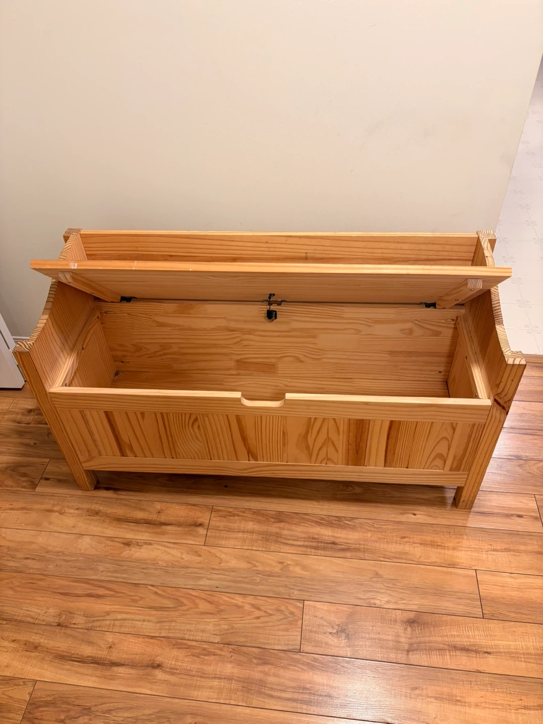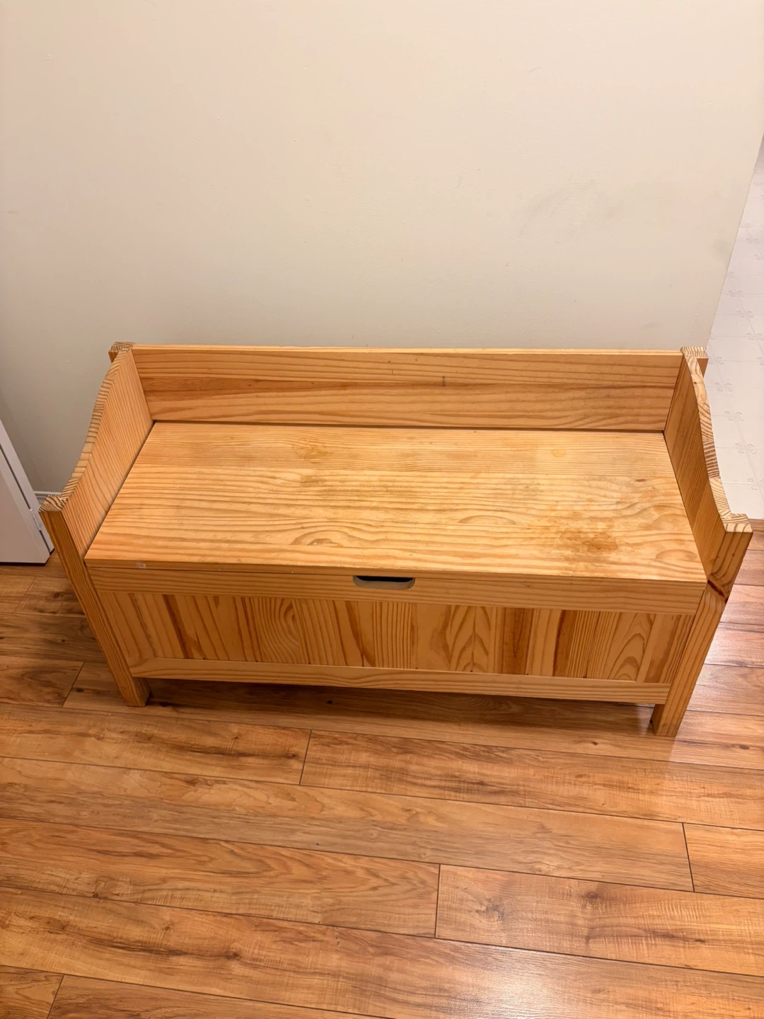 A solid pine storage bench with a hinged lid. It's great for keeping blankets, toys, or other household items tucked away. This bench provides extra seating and storage.