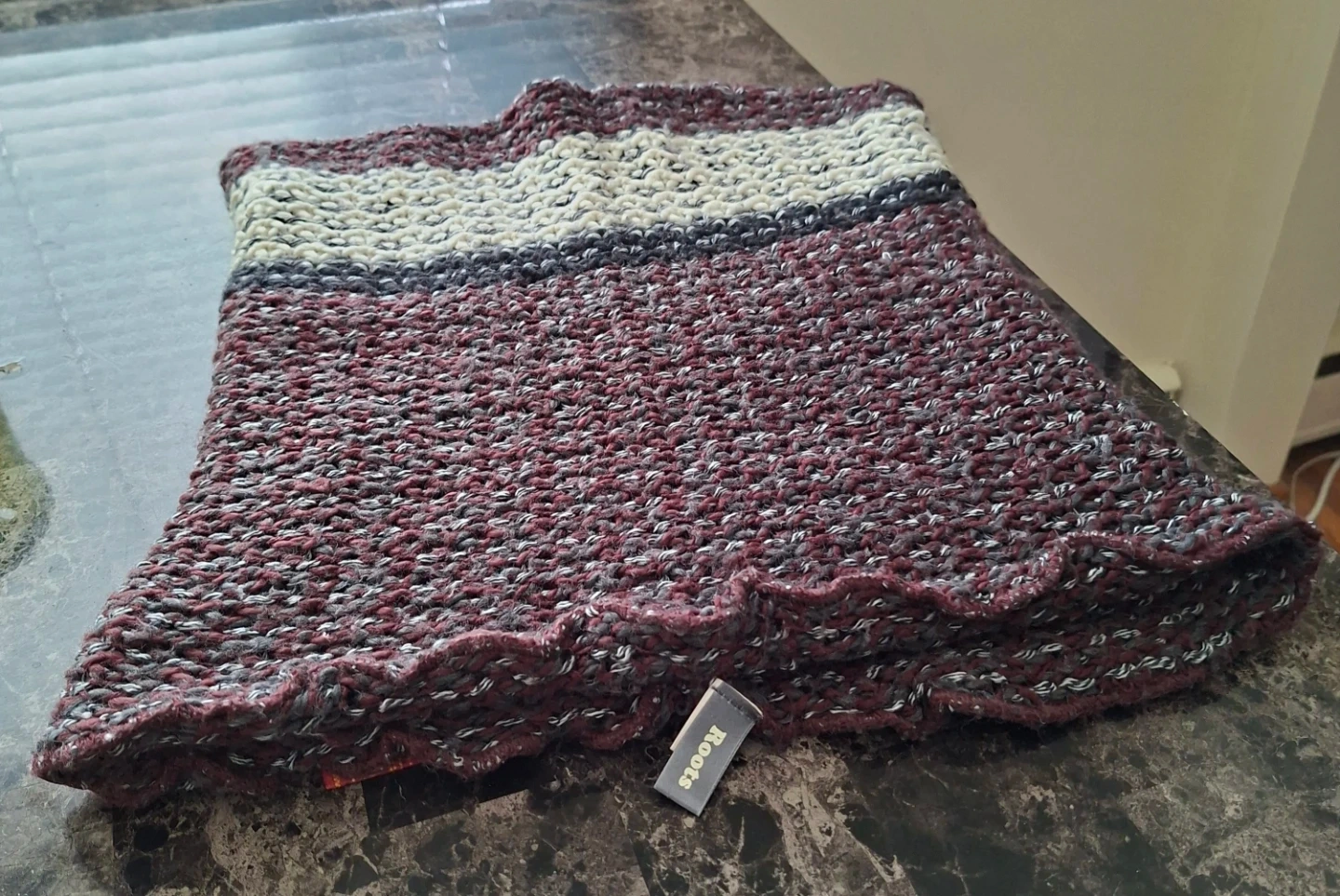 A great brand Roots, this is a cozy knitted scarf with a striped pattern in burgundy, cream, and black. It's made of a soft yarn blend. This scarf is great for adding warmth on cooler days!