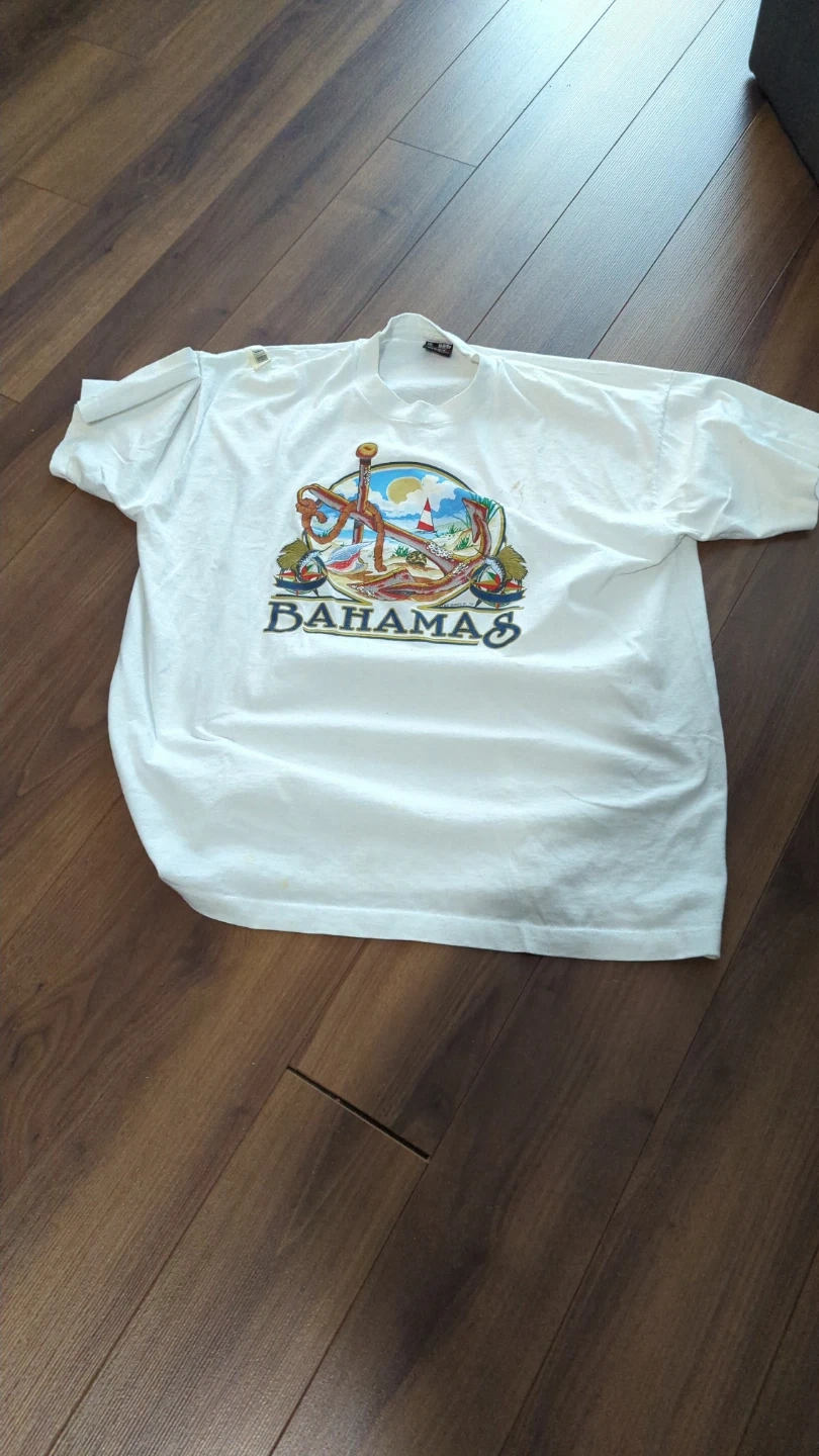 White graphic t-shirt featuring a Bahamas design with an anchor and lighthouse.. This shirt would be great for casual wear or as a souvenir!