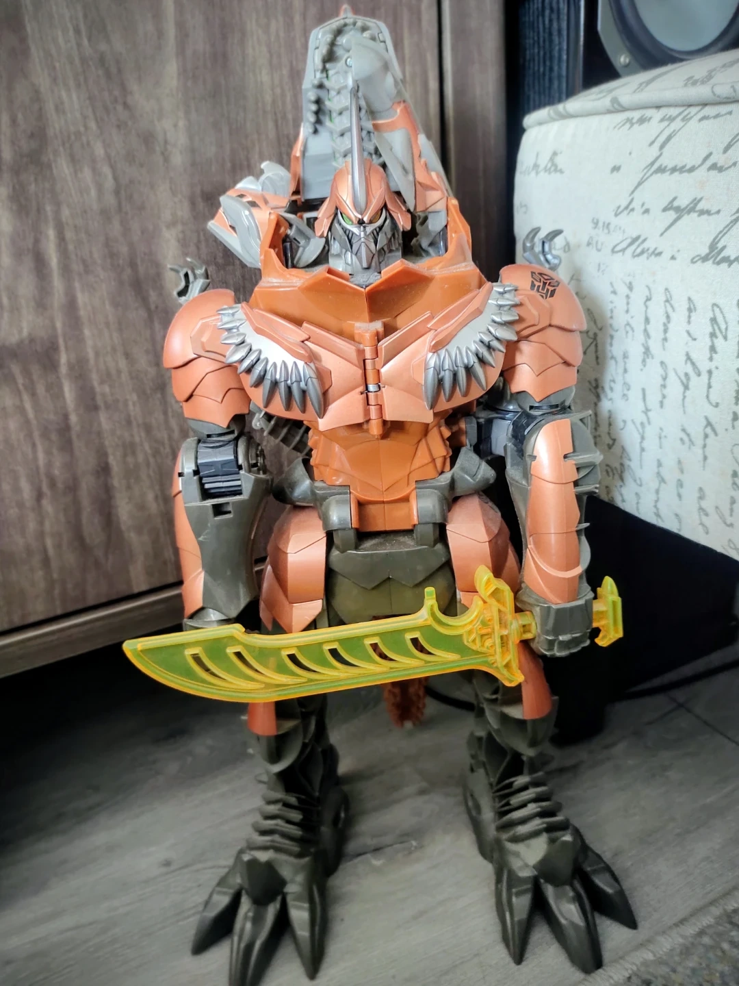 This is a Transformers Grimlock action figure. It's orange and grey with a translucent yellow sword accessory. The figure has a detailed design with articulated limbs.