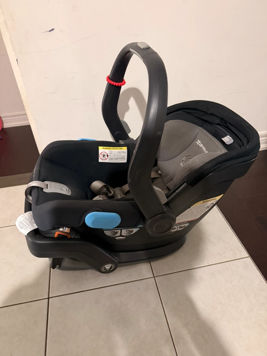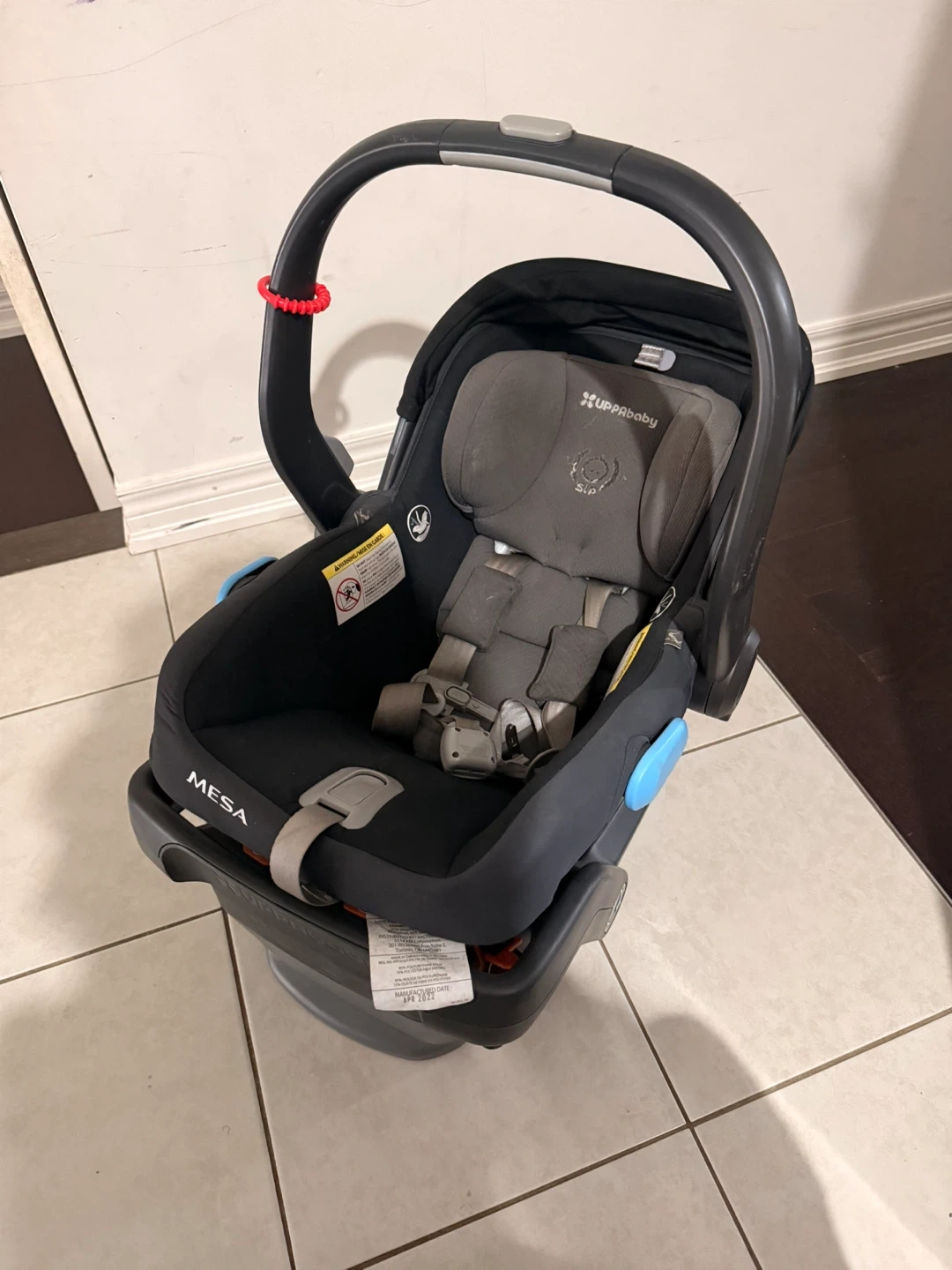 UPPAbaby MESA infant car seat in black. Includes base. Safety features are clearly marked. Great for newborns and infants on the go!
