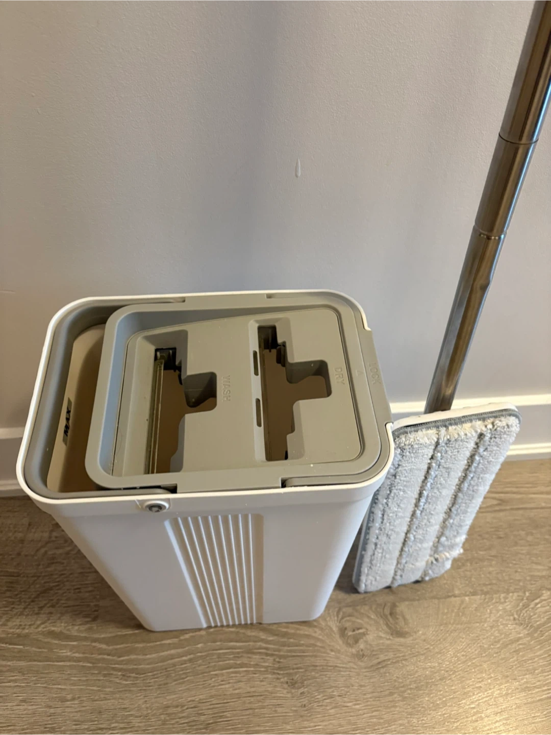 Includes bucket with built-in wash & dry system, flat mop, and microfiber pads. Works perfectly for hardwood, laminate, and tile floors. Easy to use and very convenient for small spaces.