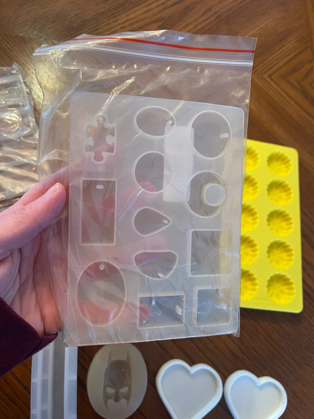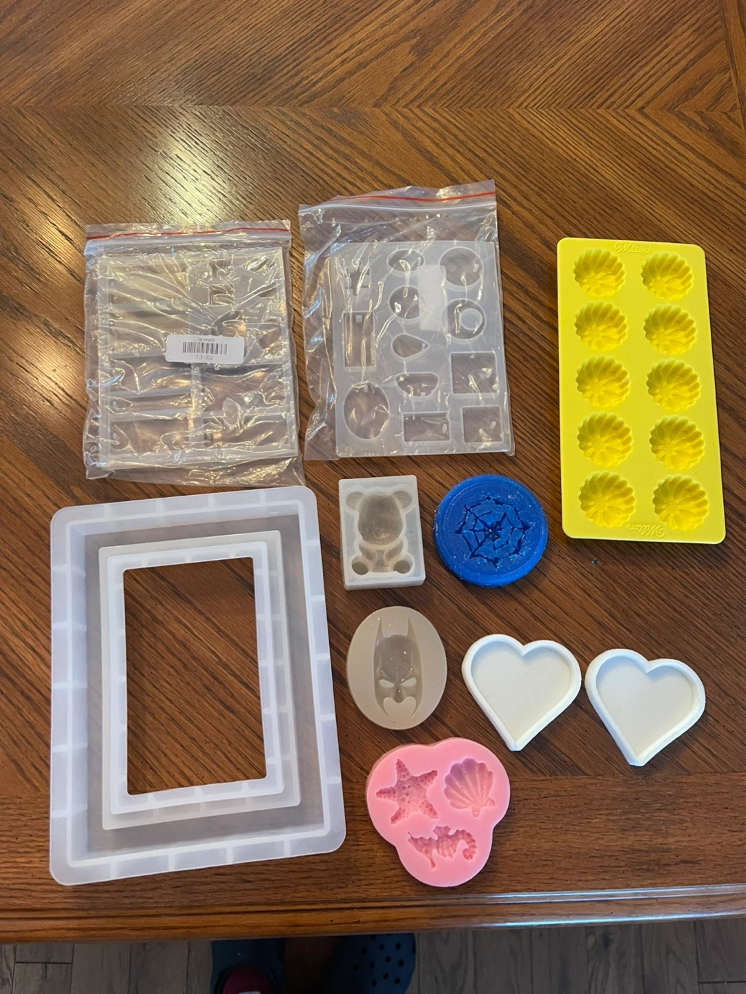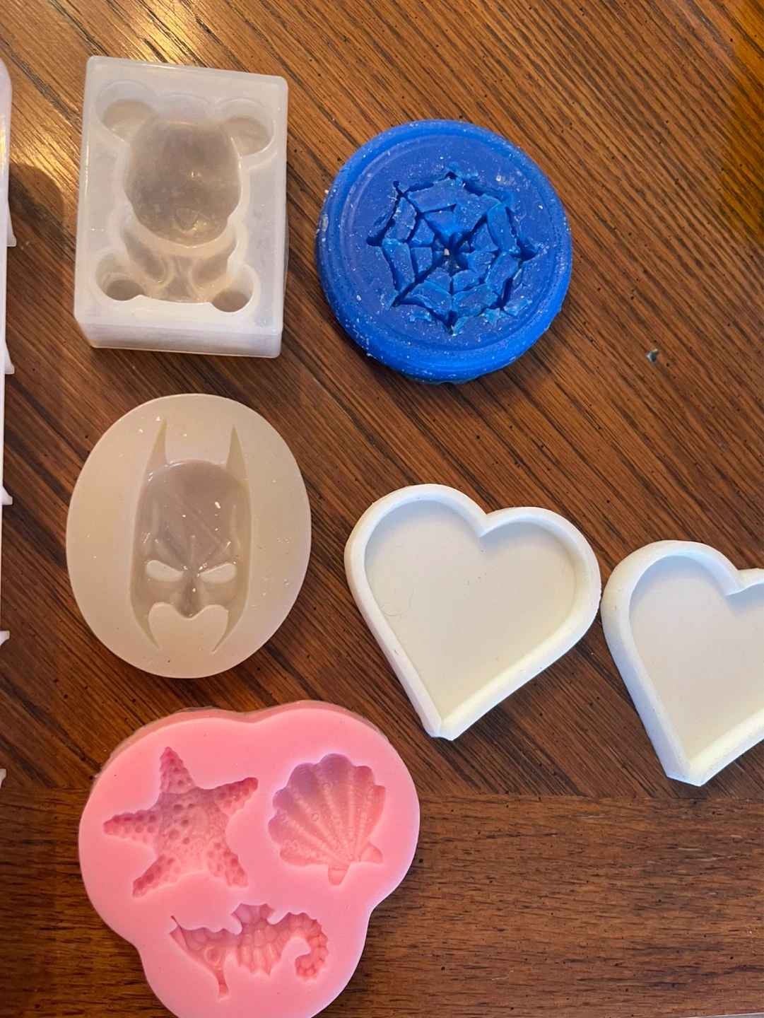 This is a collection of various resin molds for crafting. Includes geometric shapes, hearts, a teddy bear, Batman logo, flowers, and sea creatures. A yellow Wilton flower mold is also included.