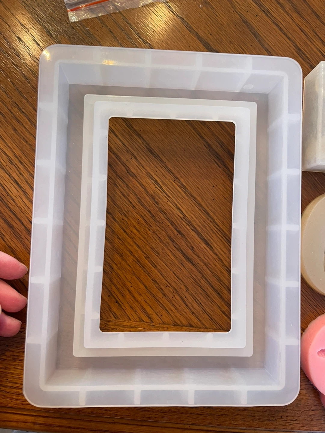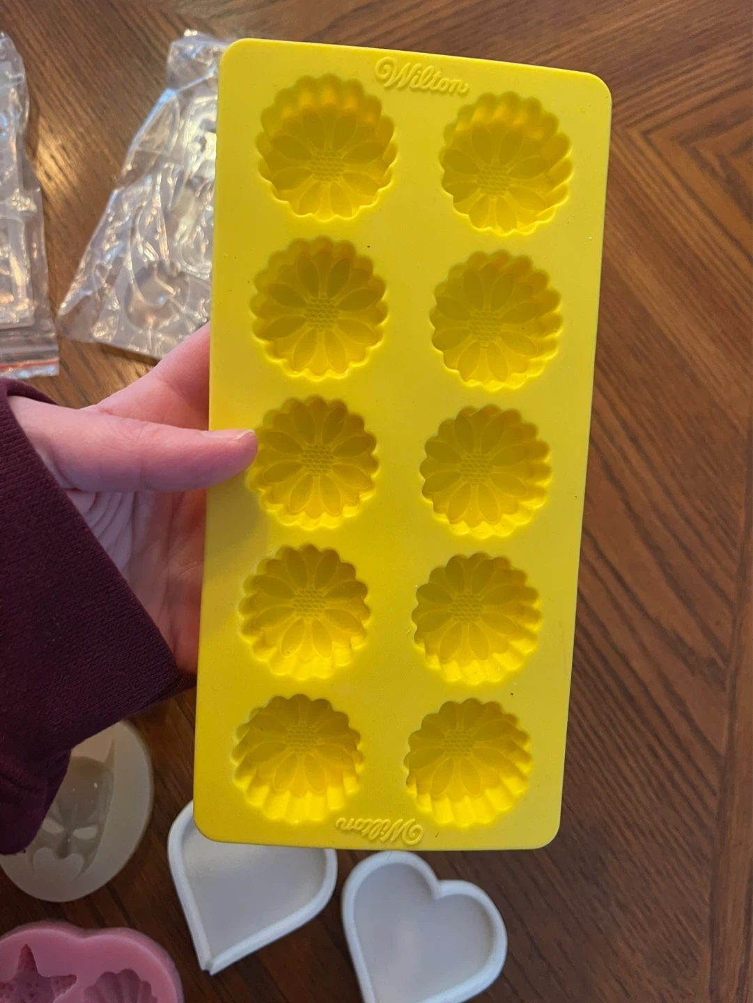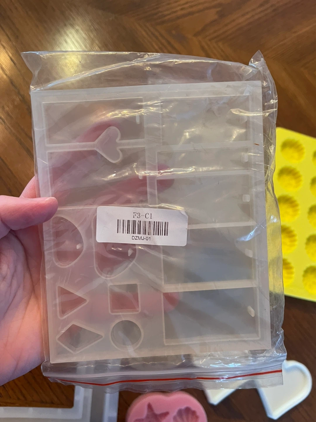 This is a collection of various resin molds for crafting. Includes geometric shapes, hearts, a teddy bear, Batman logo, flowers, and sea creatures. A yellow Wilton flower mold is also included.