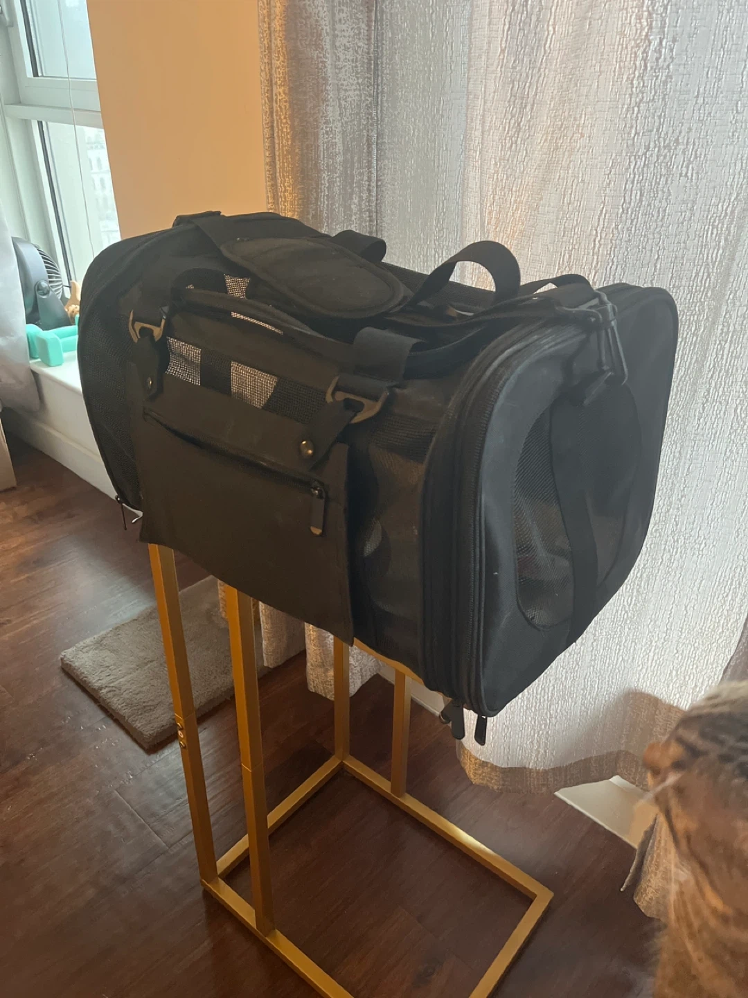 This is a used black pet carrier bag with mesh ventilation. It's designed for safe and comfortable travel for your pet. Features multiple zippers and carrying handles.