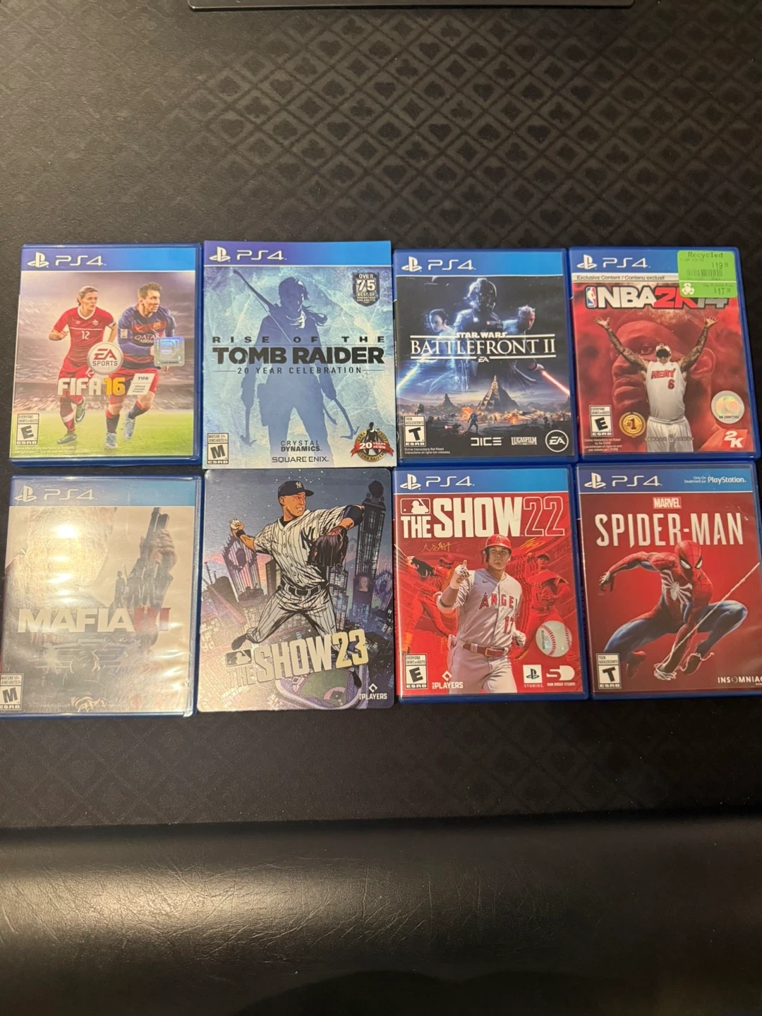 Bundle of eight PlayStation 4 video games. Includes FIFA 16, Rise of the Tomb Raider, Star Wars Battlefront II, NBA 2K17, Mafia III, MLB The Show 23, MLB The Show 22, and Marvel's Spider-Man. All games are for PS4.