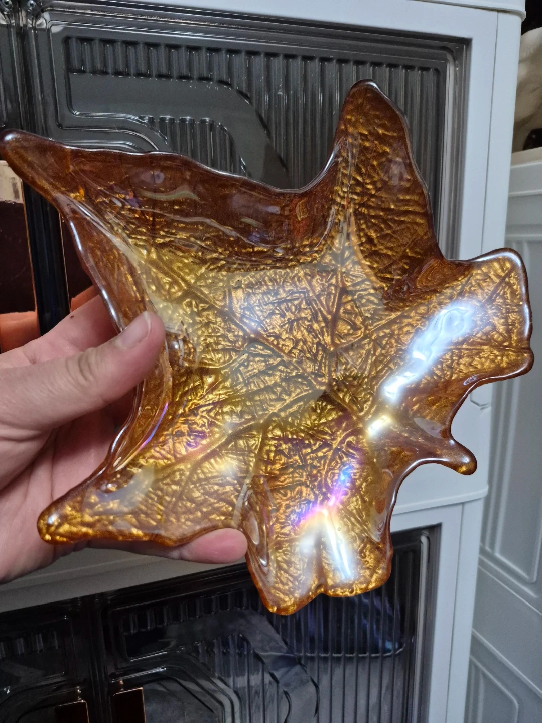 A decorative glass dish with a beautiful amber, iridescent finish. It's shaped like a stylized leaf and has a textured surface. This piece adds a touch of elegance to any space.