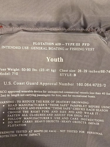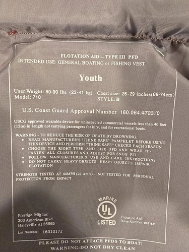 The Prestige Floatation Device Aid Type III PFD Life Jacket Vest is designed for youth weighing between 50-90 lbs. This life jacket vest, model 710, is made in China and is not a modified item. It provides a secure fit and safety for water sports activities, ensuring the wearer stays afloat in case of emergencies. Ideal for swimming, boating, or any water-related adventure, this life jacket vest offers peace of mind for parents and guardians.