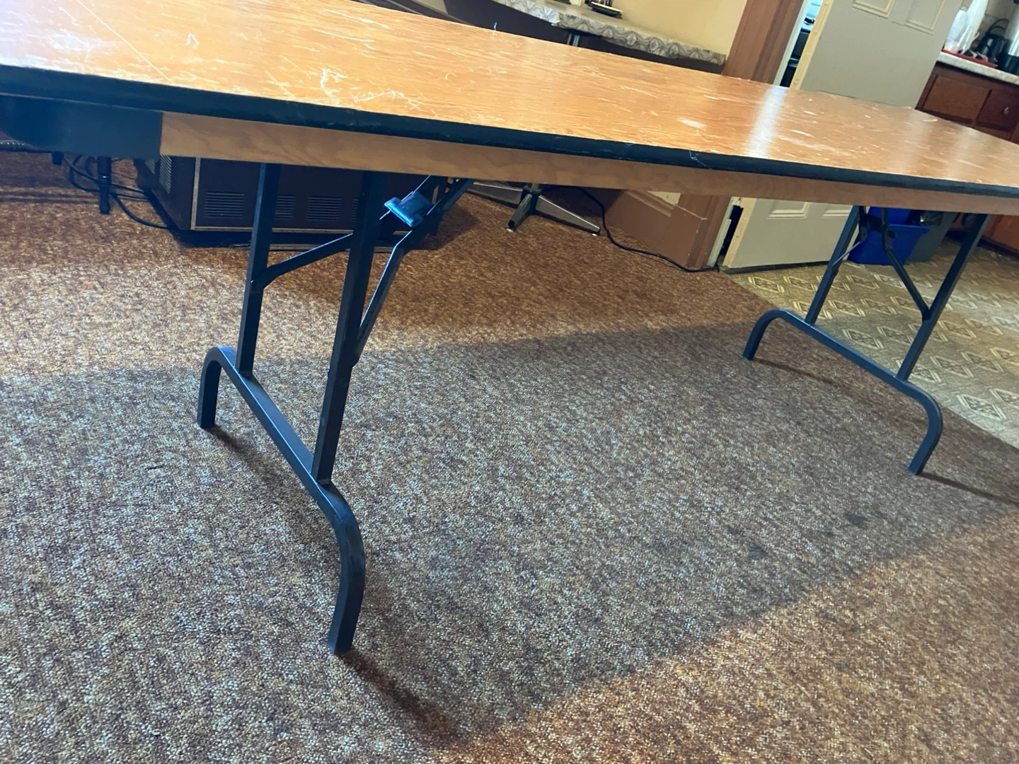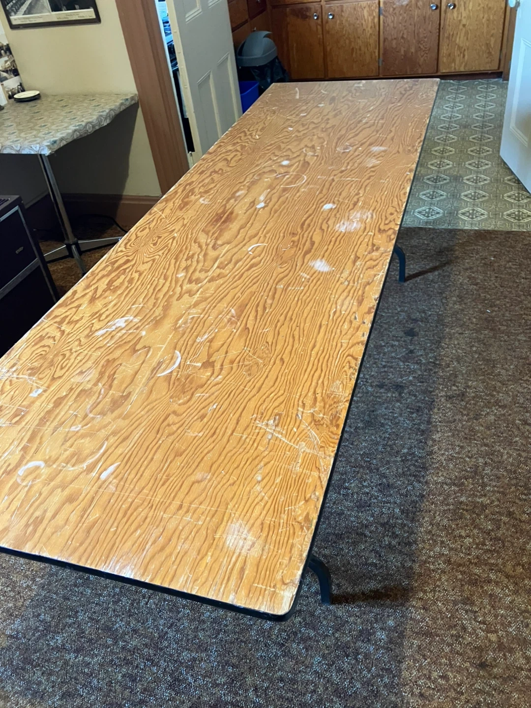 Large table with a plywood laminate top and folding metal legs. It's suitable for events or extra workspace. Legs fold flat for storage.