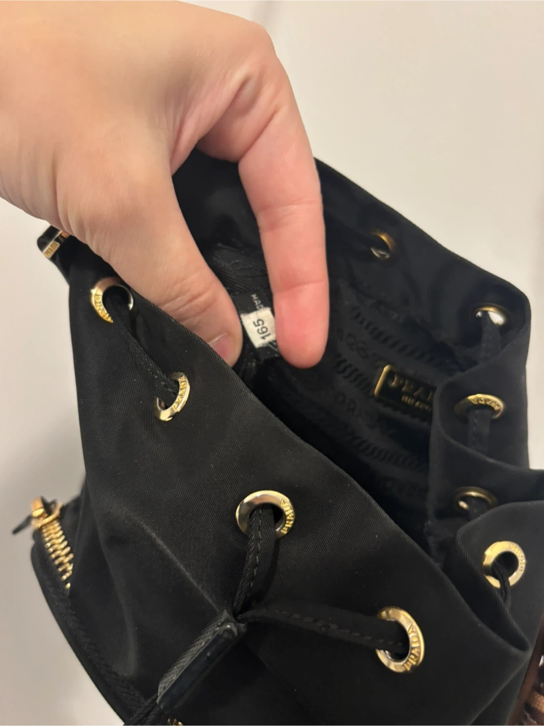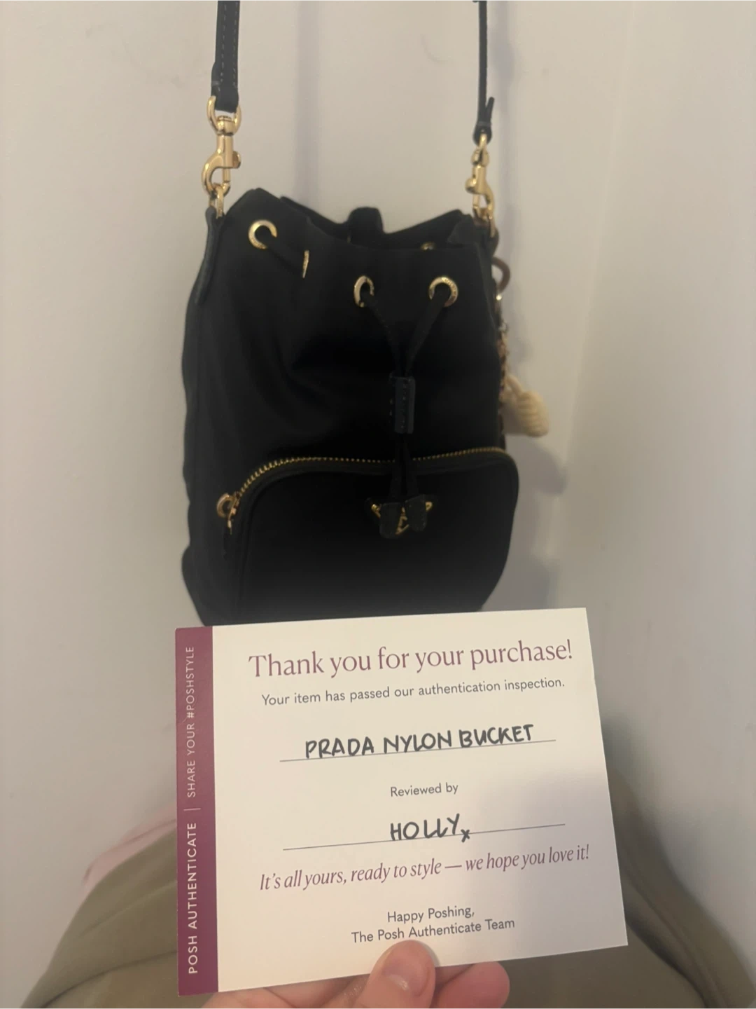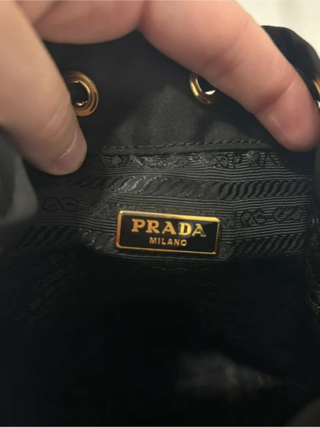 Selling a stylish Prada bucket bag in classic black nylon! It's in great condition and features gold-tone hardware, a drawstring closure, and the iconic Prada logo. Perfect for everyday use or a night out