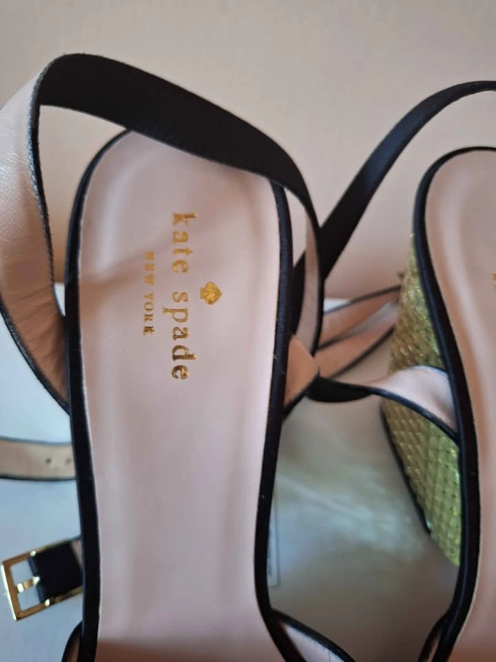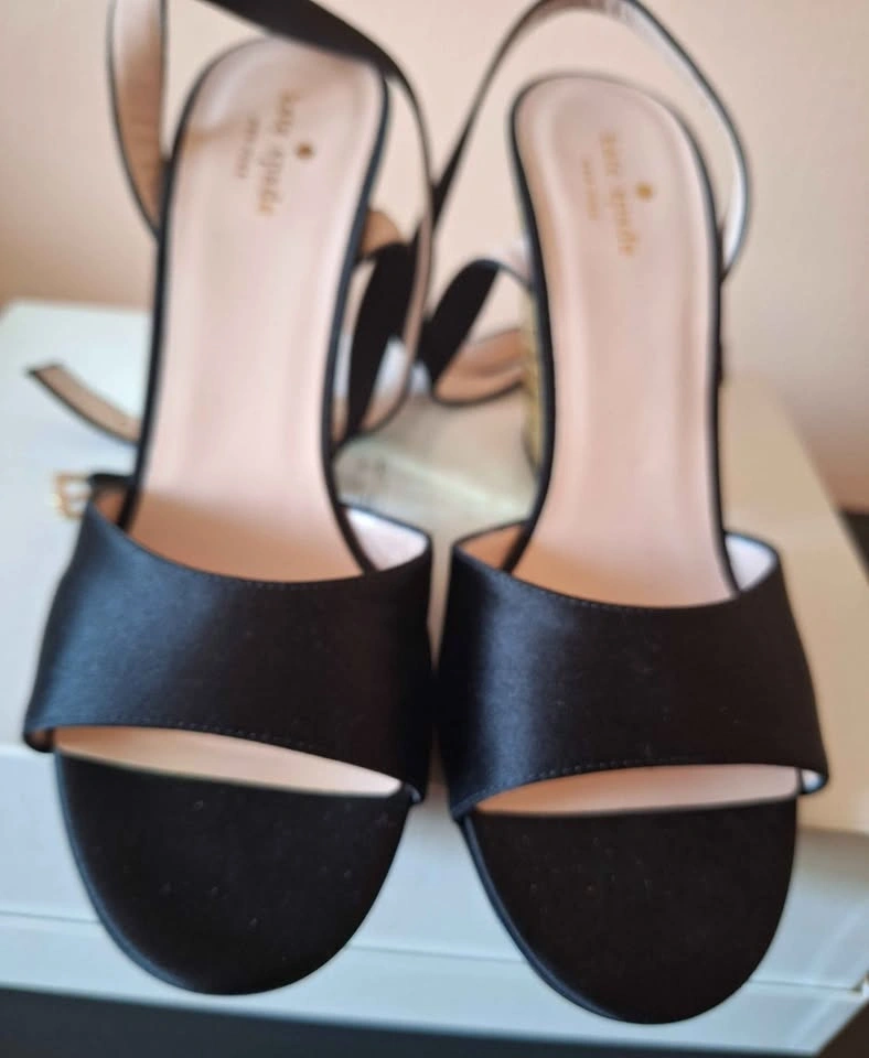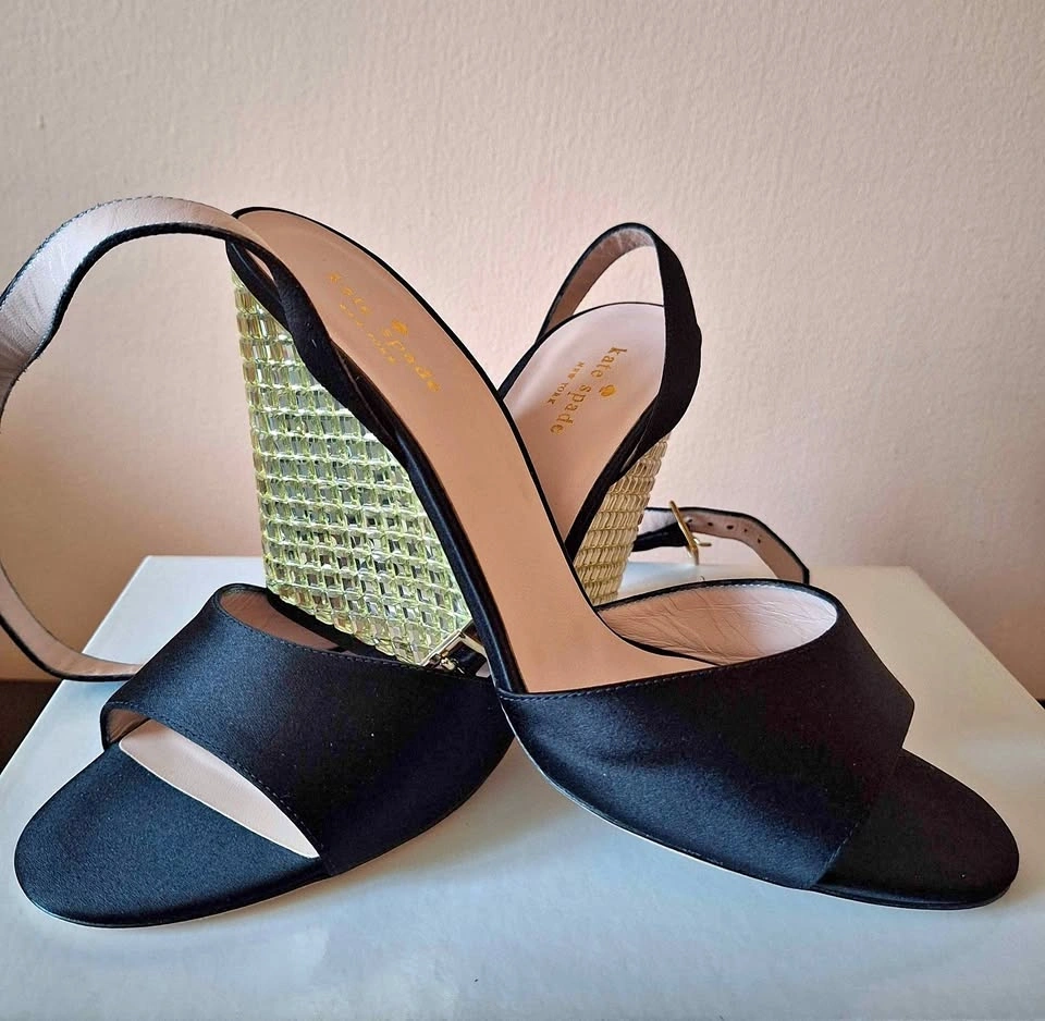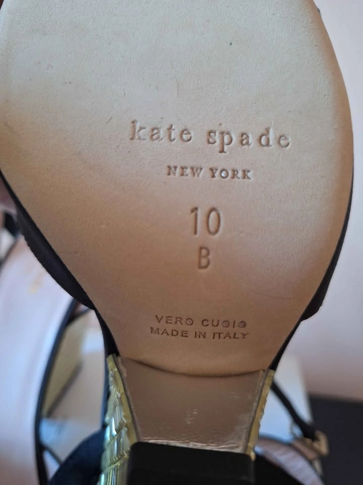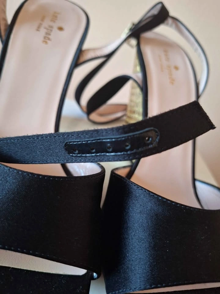 Kate Spade Isadora Black Satin Gold Stone Heel Sandals - Size 10