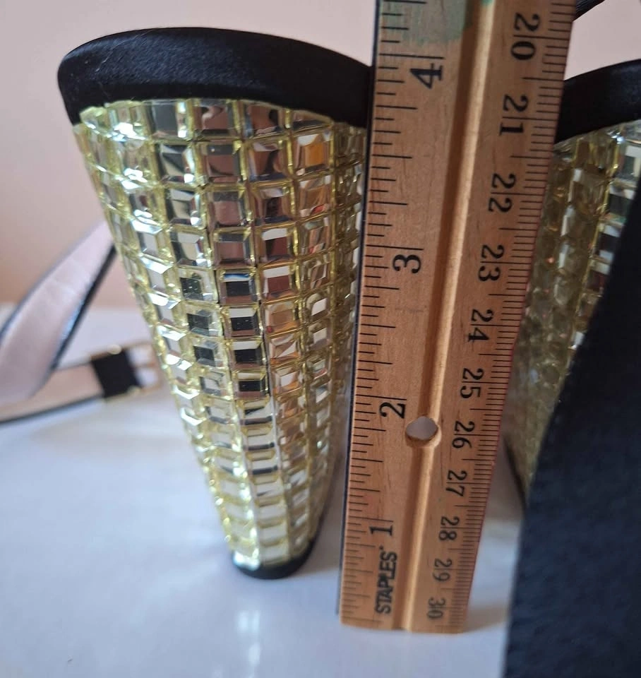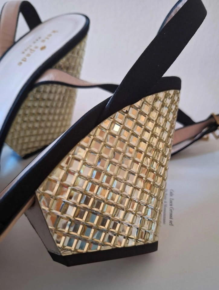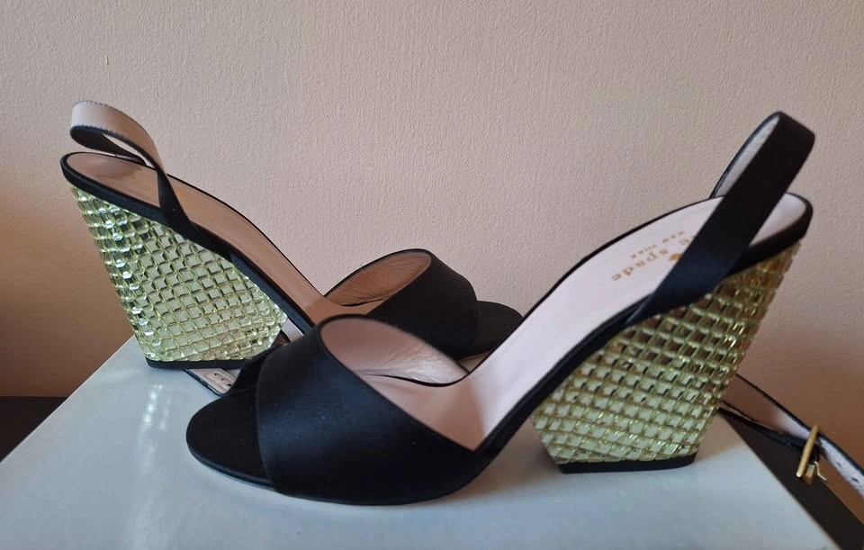 These new Kate Spade New York Isadora black satin strappy sandals feature a high wedge heel with beaded accents and gold stone details. They have a buckle closure and leather outsole. Made in Italy. No box.