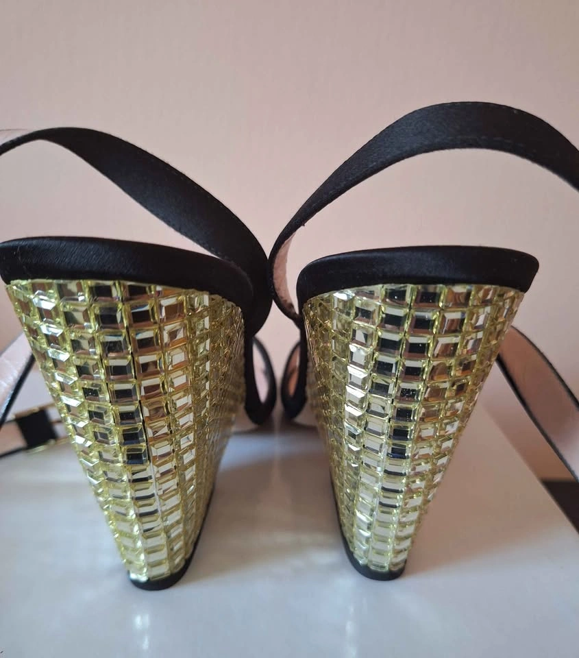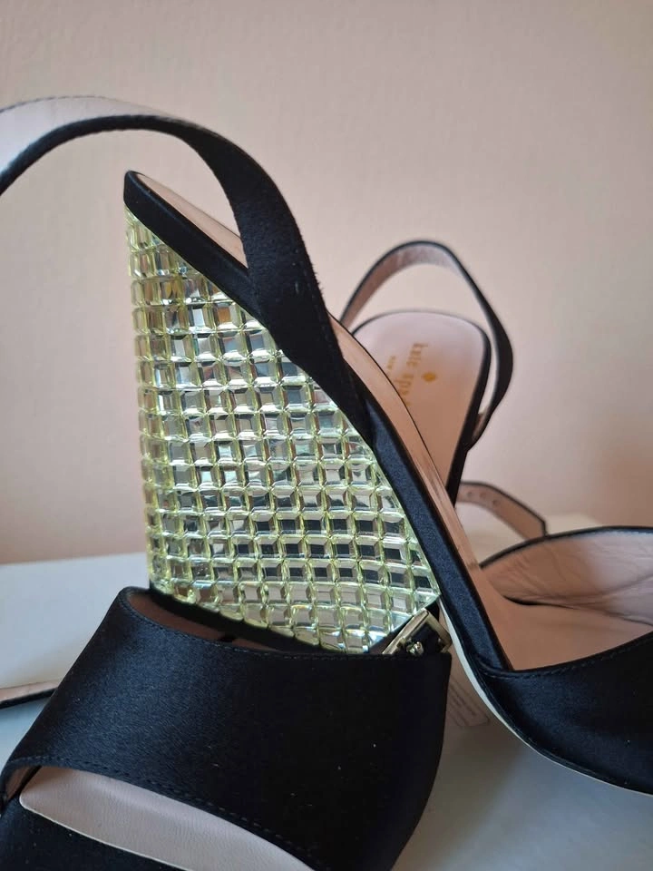Kate Spade Isadora Black Satin Gold Stone Heel Sandals - Size 10