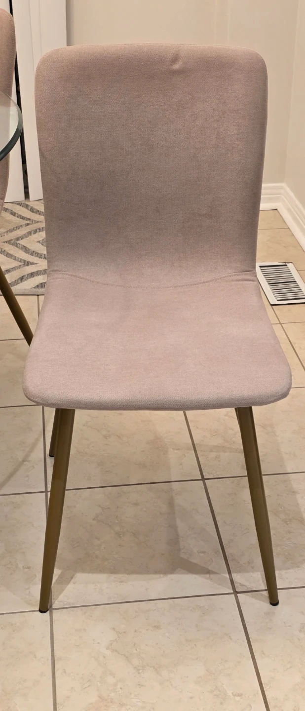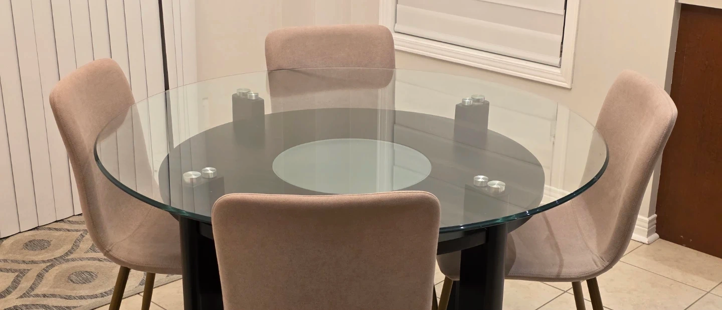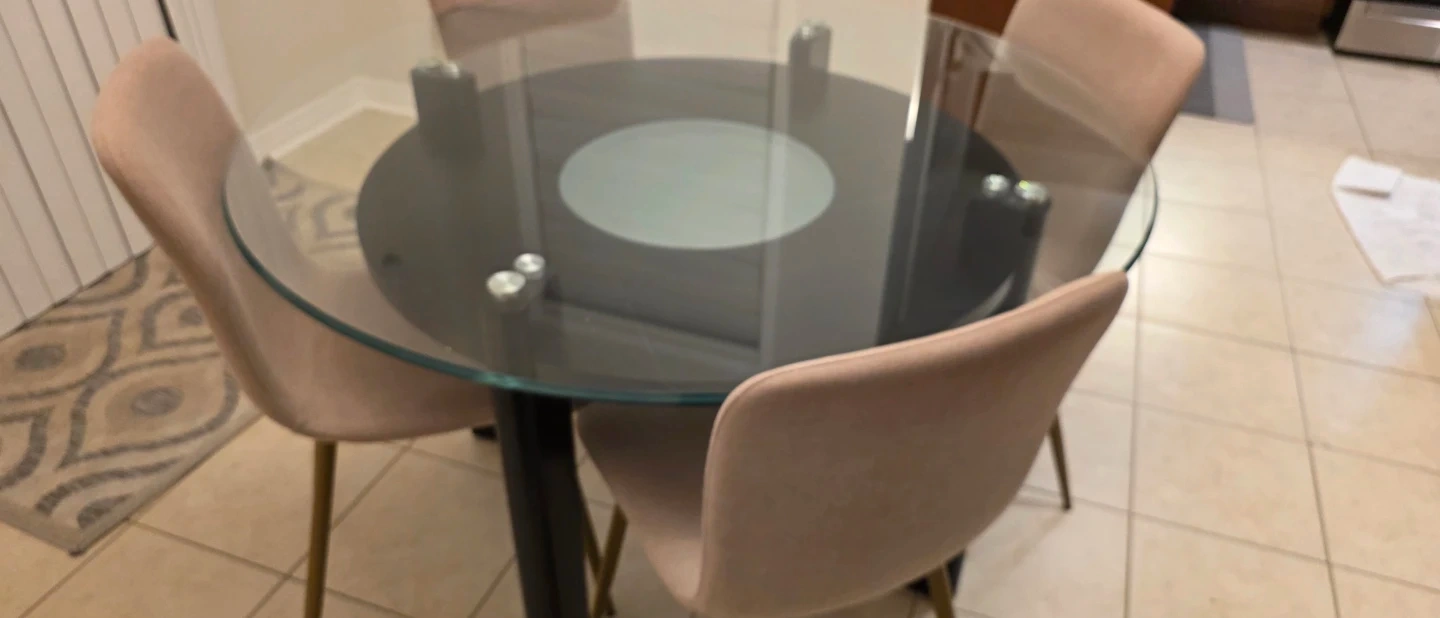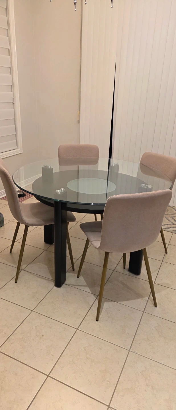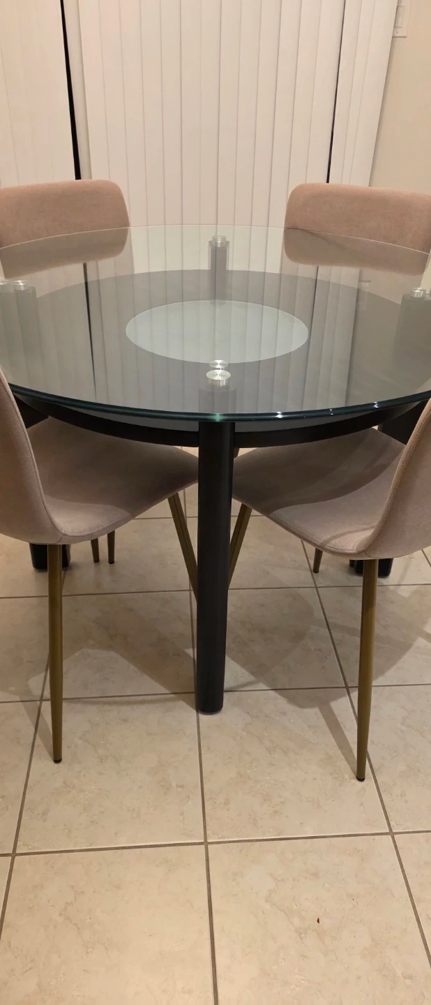 Glass table top with rounded edges, 4 feet in diameter and half inch thick. Base is 3 feet in diameter and 30 inches tall. 4 fabric chairs and no stains.