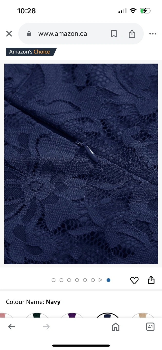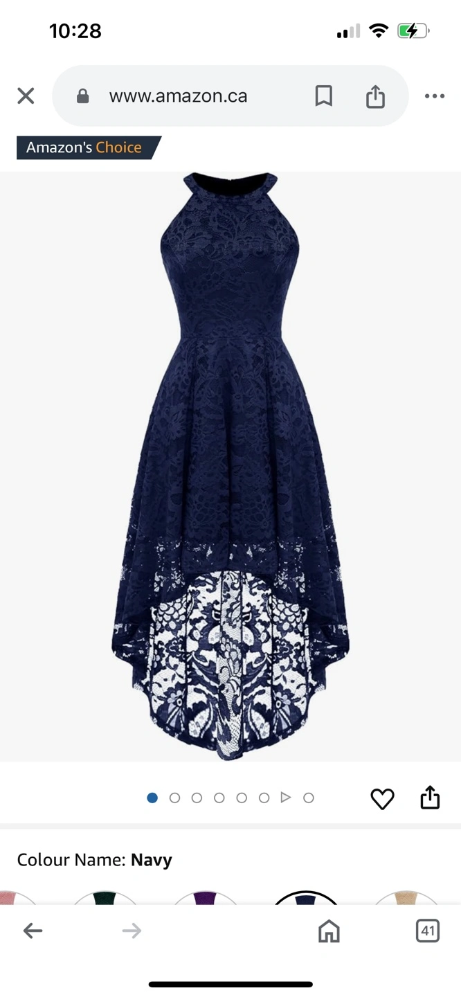 Stunning navy blue lace dress. Features a halter neck and high-low hemline. Back zipper closure. Great for special occasions.