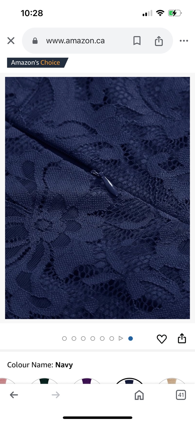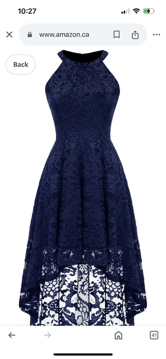 Stunning navy blue lace dress. Features a halter neck and high-low hemline. Back zipper closure. Great for special occasions.