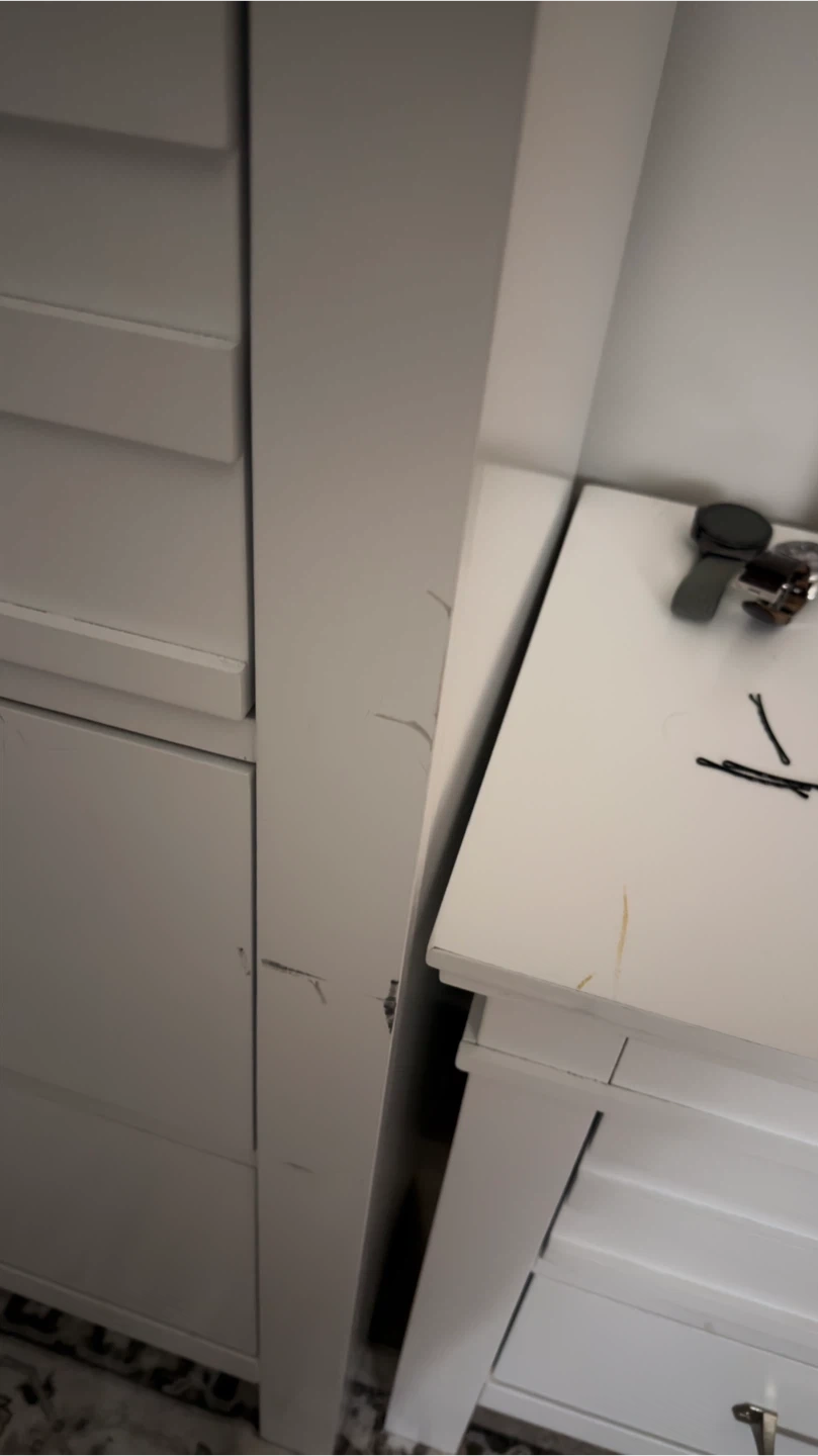 White dresser with a large mirror. It has multiple drawers for storage. Some minor scuffs are present on the dresser frame and top surface.