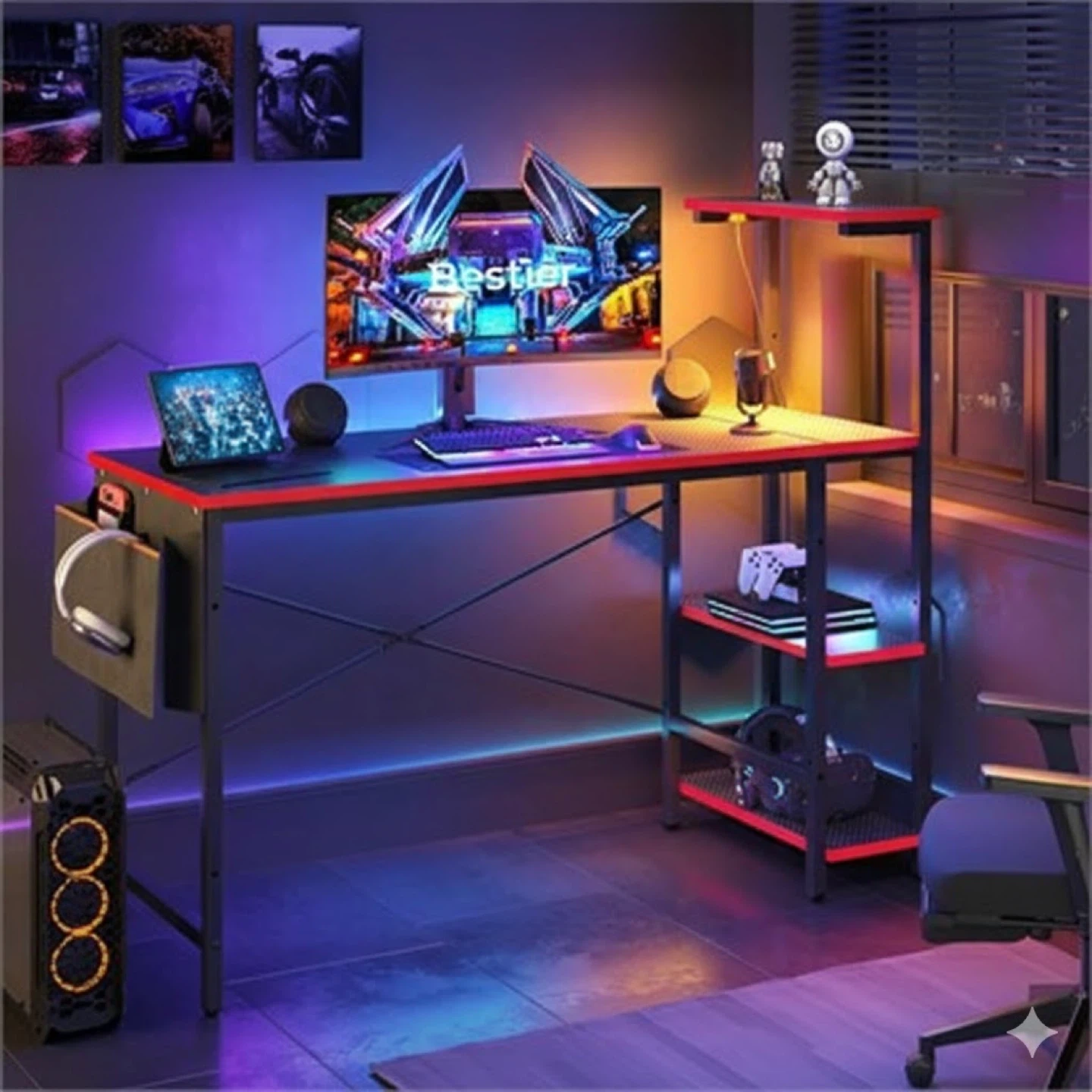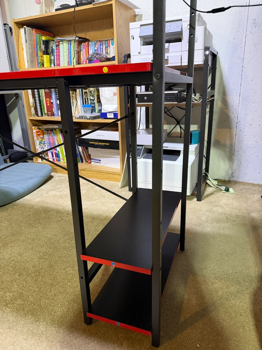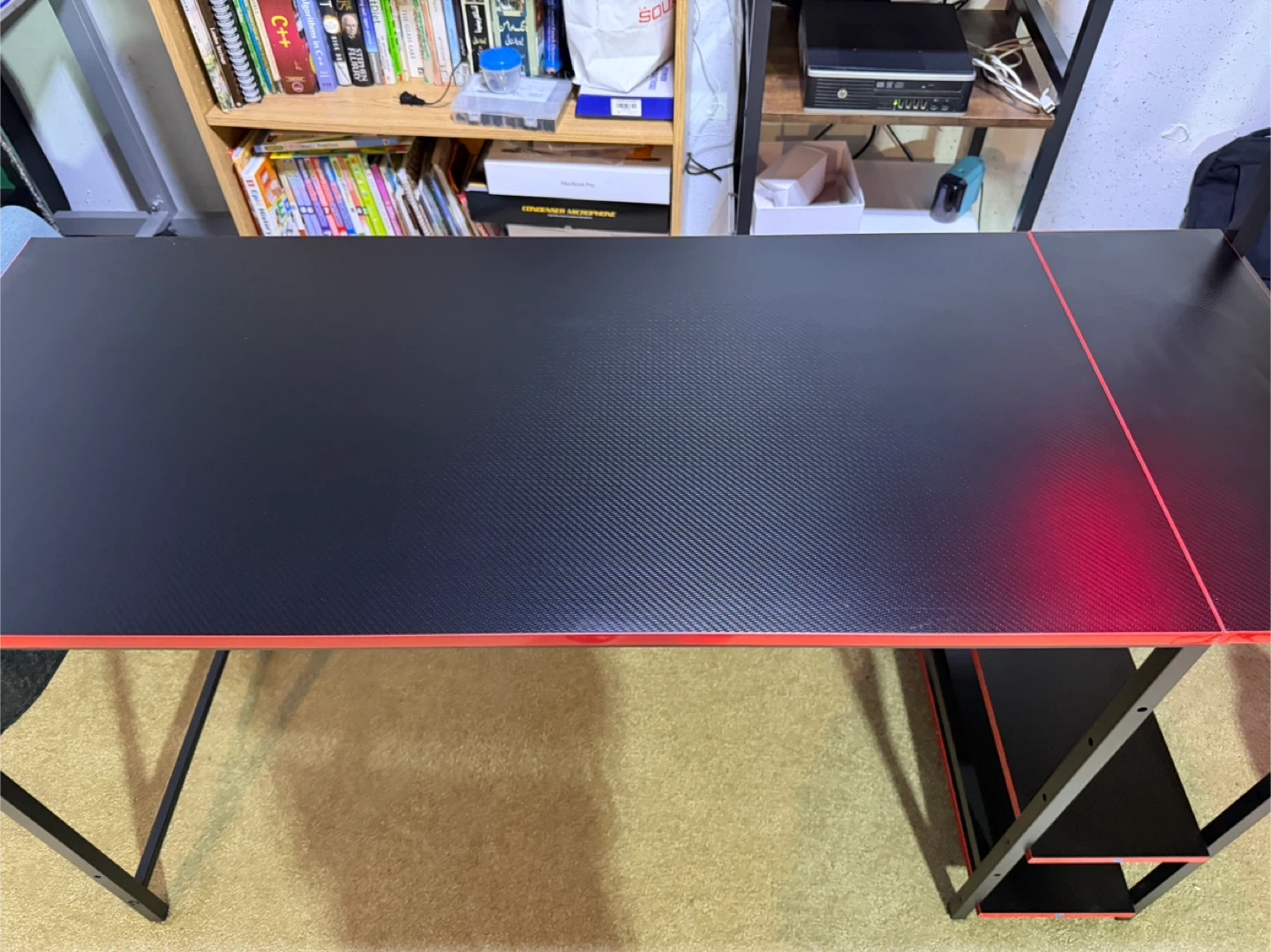 This brand new fully assembled black gaming desk features a carbon fiber texture and red trim.