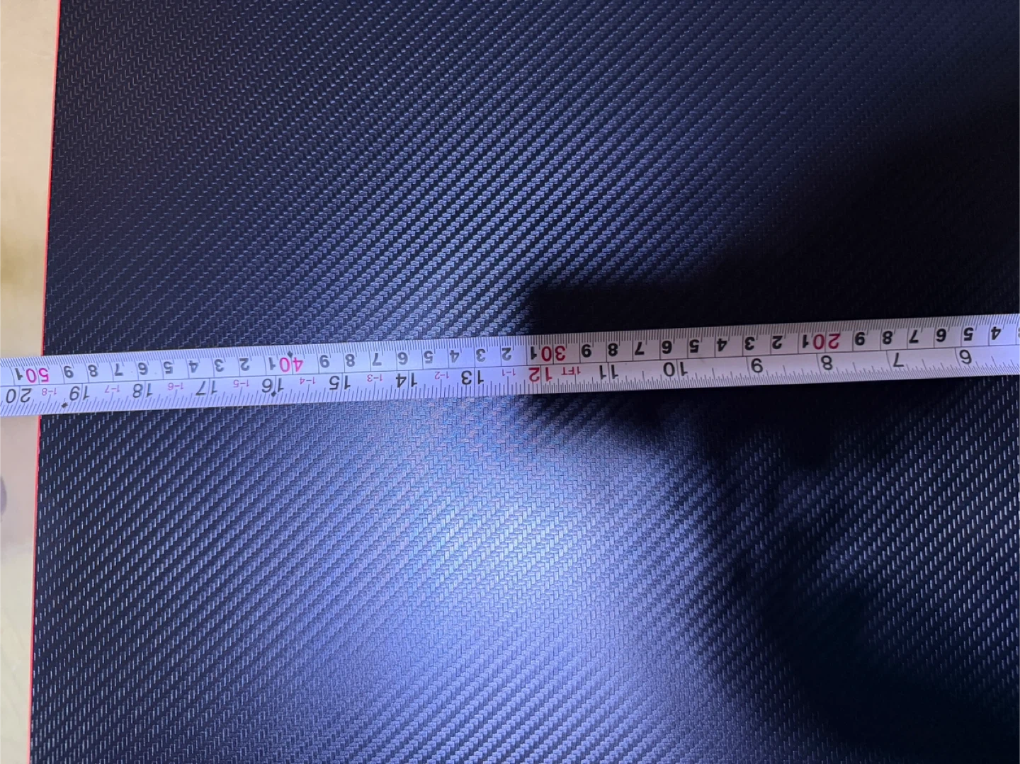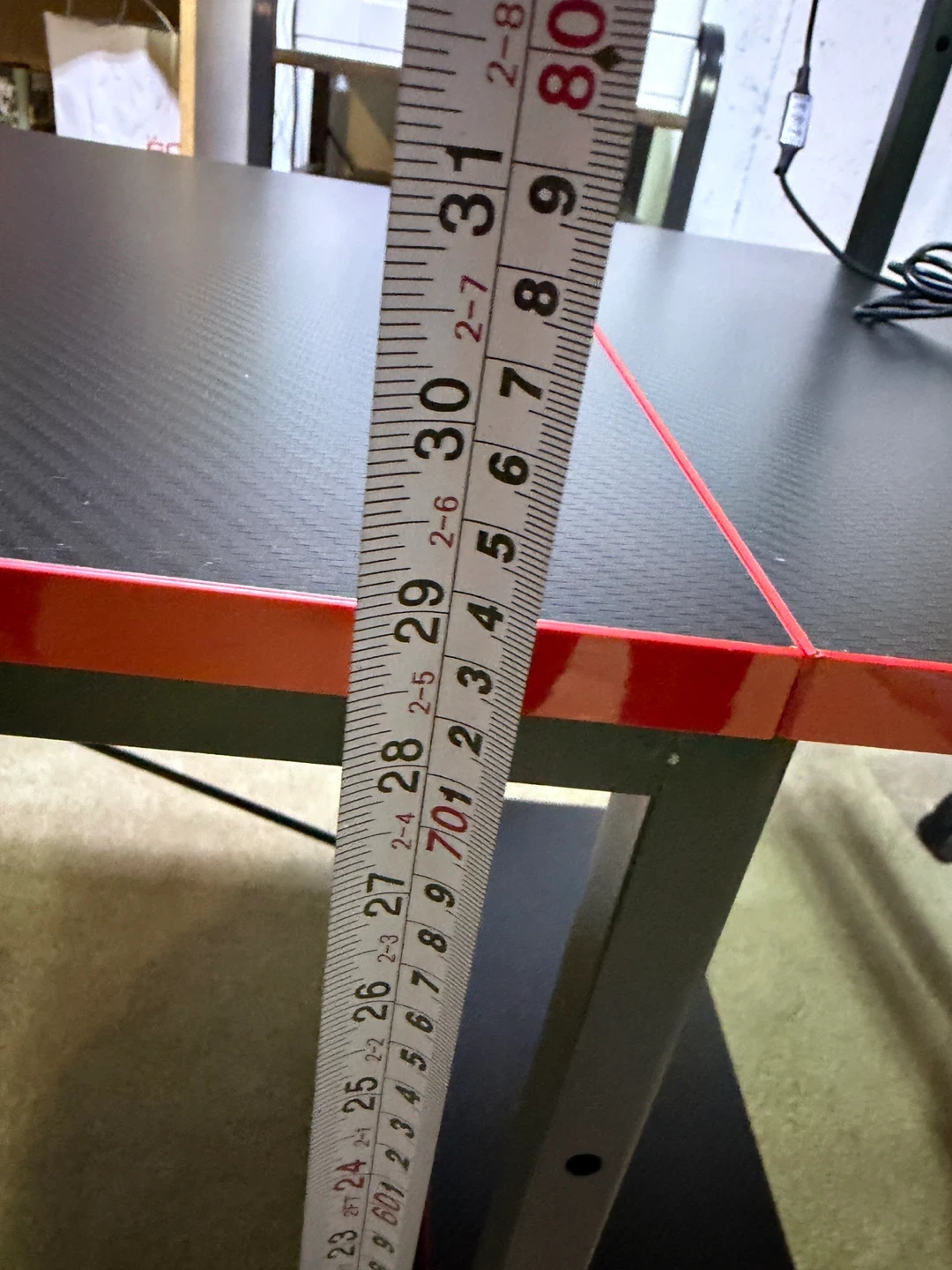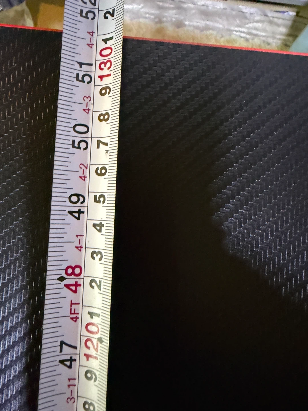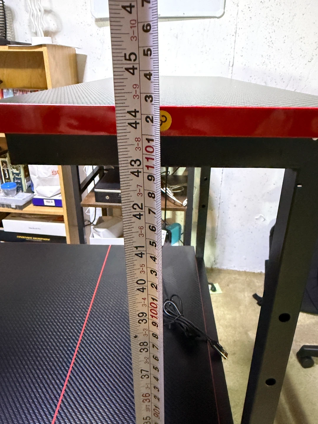 This brand new fully assembled black gaming desk features a carbon fiber texture and red trim.