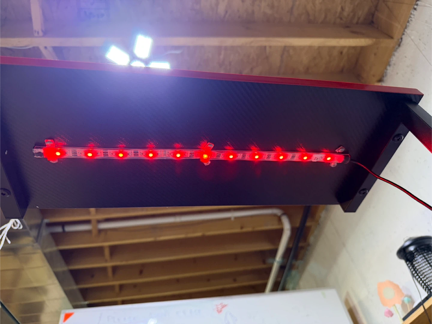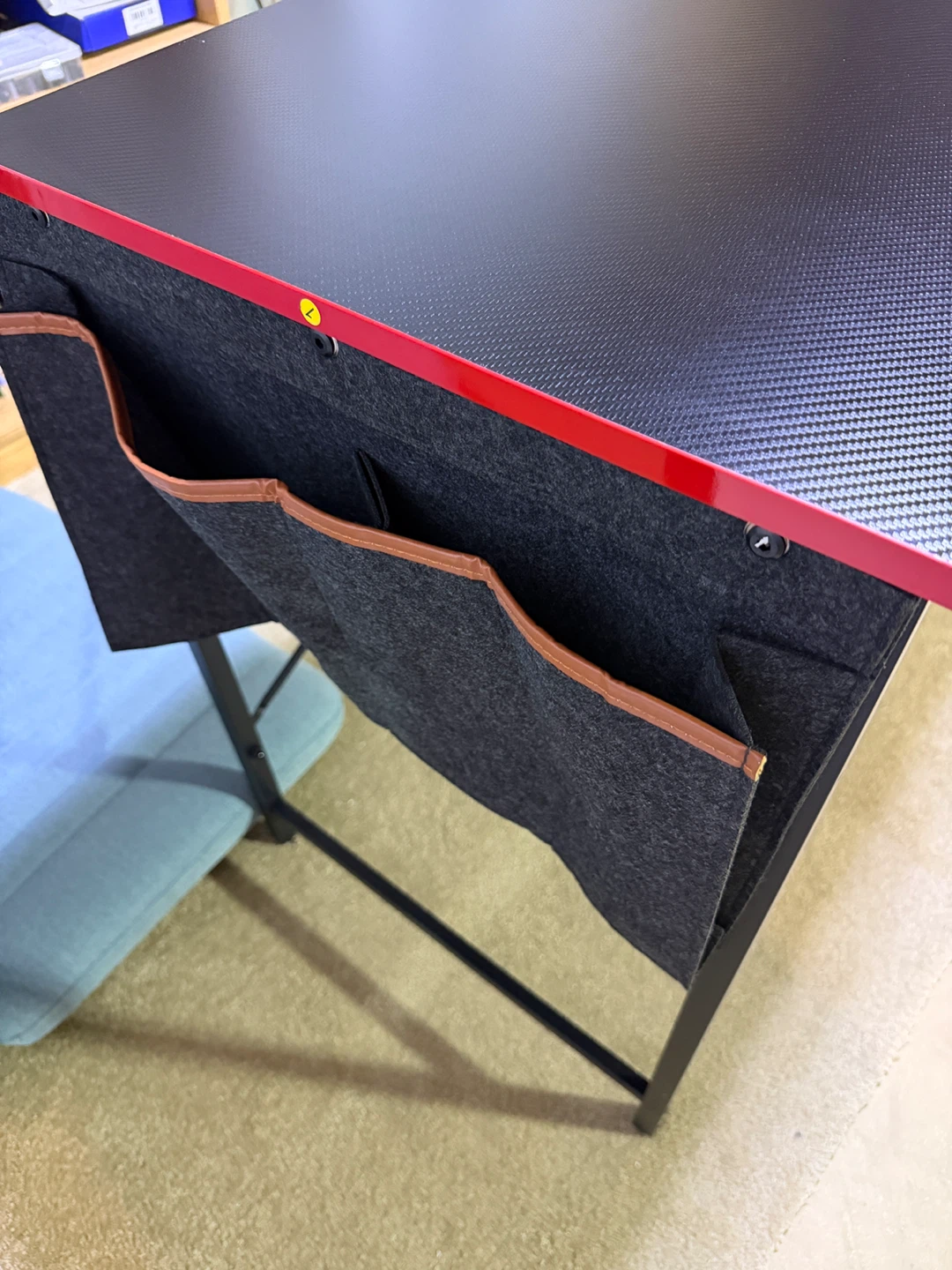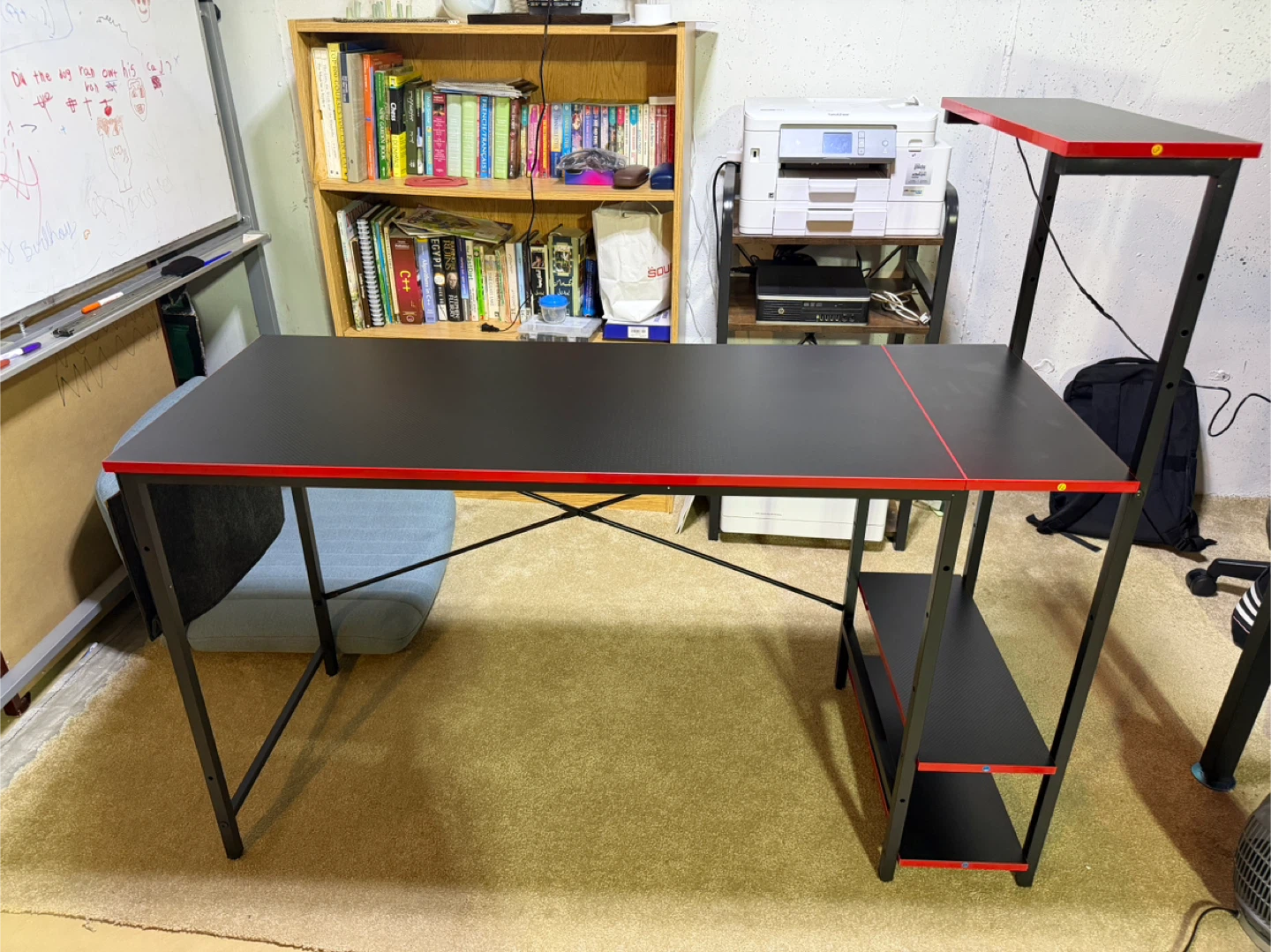 This brand new fully assembled black gaming desk features a carbon fiber texture and red trim.