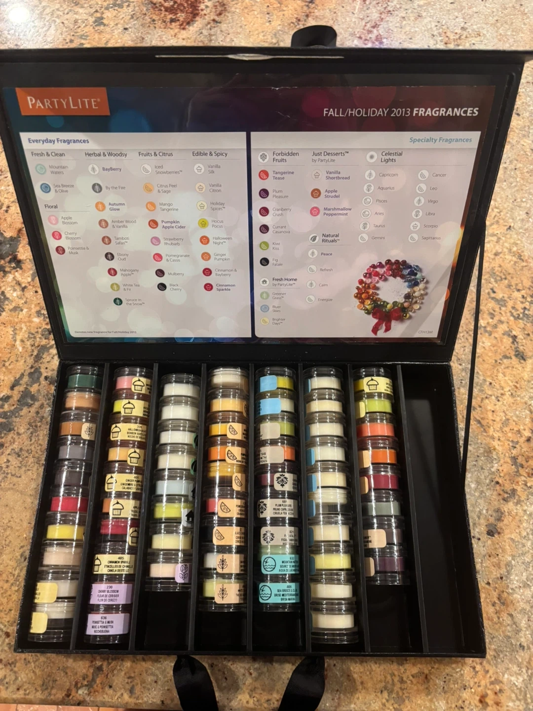 Selling a PartyLite Fall/Holiday Fragrances set! It comes in a carrying case with a variety of scents. The set includes both everyday and specialty fragrances. The fragrances are organized into categories such as Fresh & Clean, Herbal & Woody, Fruits & Citrus, Edible & Spicy, Forbidden Pleasures, Just Desserts, and Celestial Scents