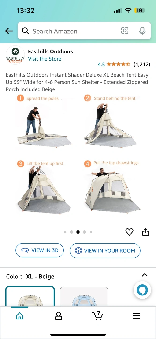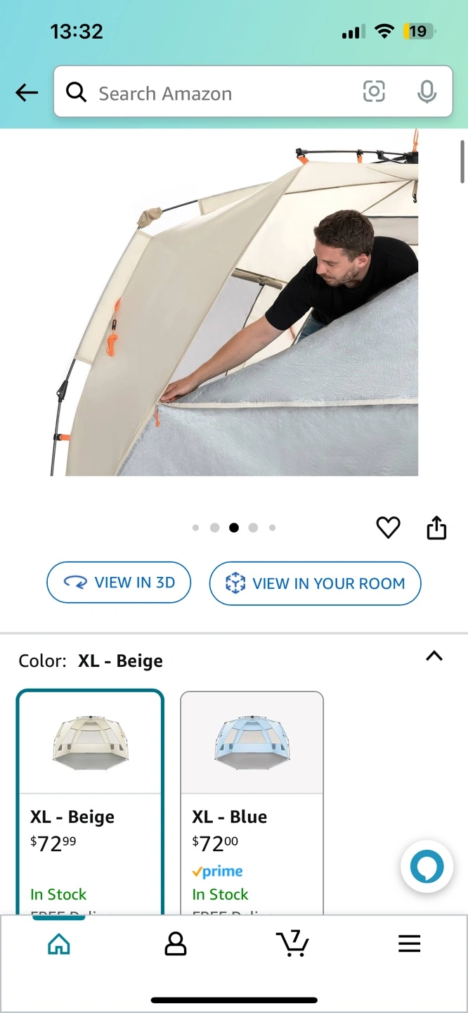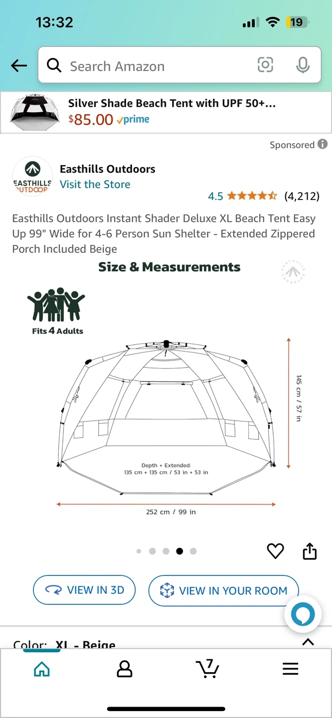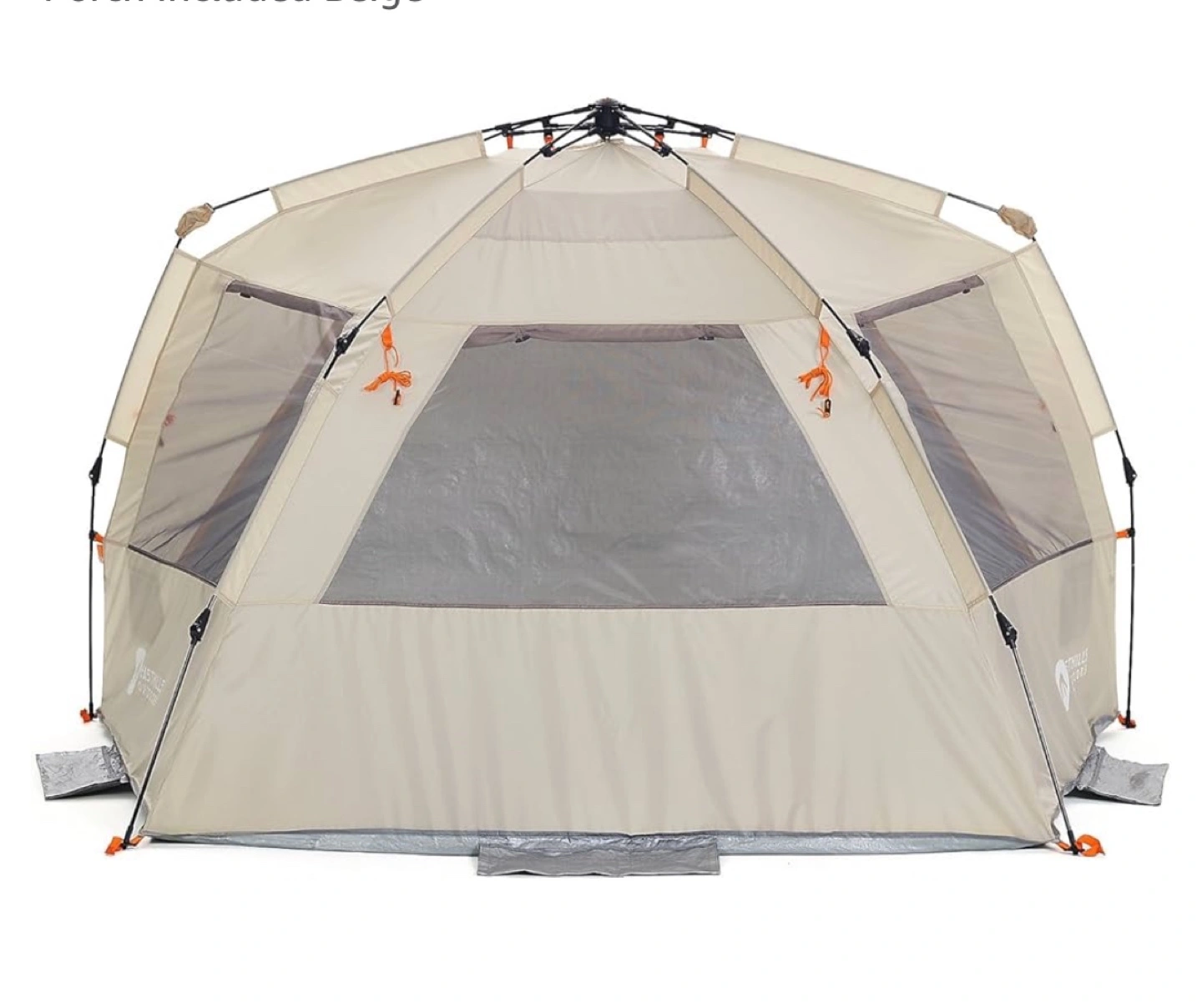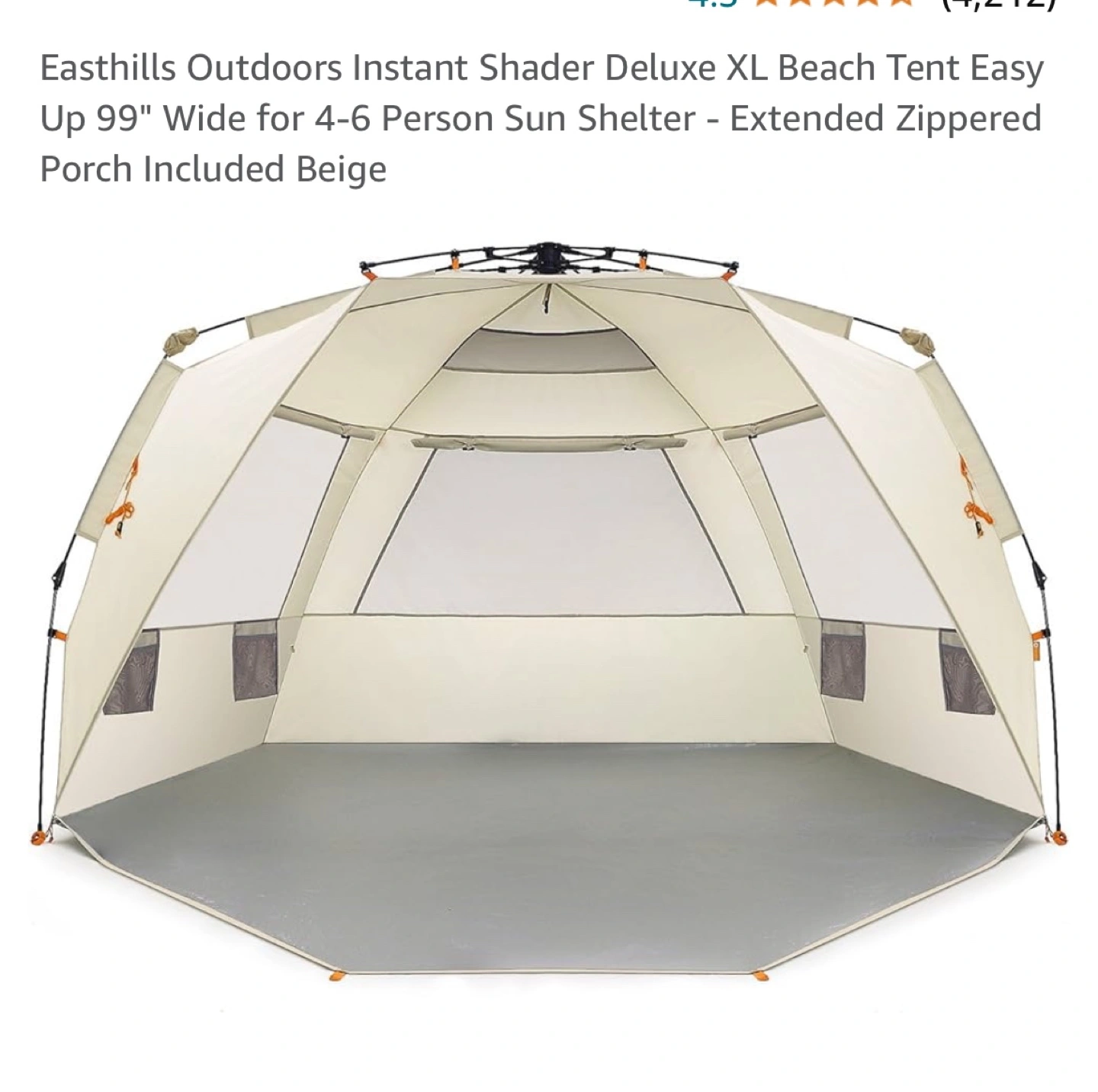 Beige instant shade beach tent. Fits 4-6 people. Easy set up. Extended zippered porch. Includes carrying bag.