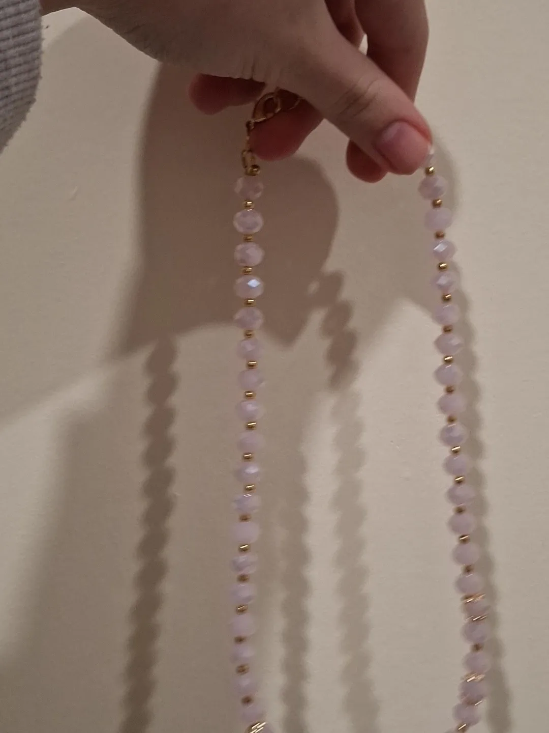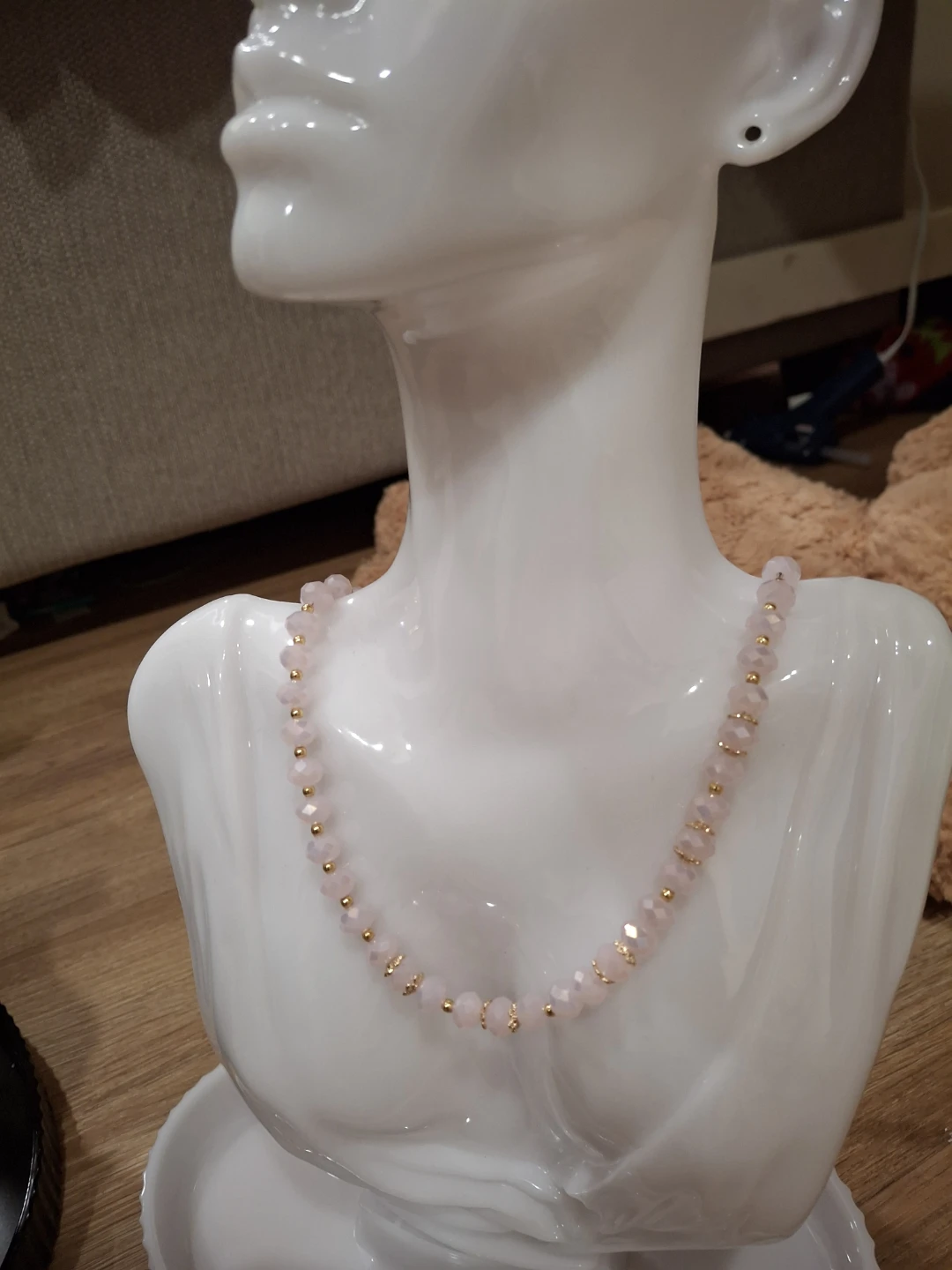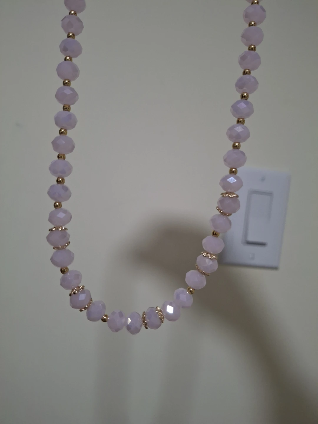 A delicate chain necklace with light pink faceted beads and small gold-tone accents. It features a secure clasp closure. This necklace adds a subtle touch of elegance to any outfit.