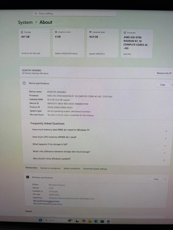 HP Pavilion Desktop PC - RX 550, 16GB RAM, SSD