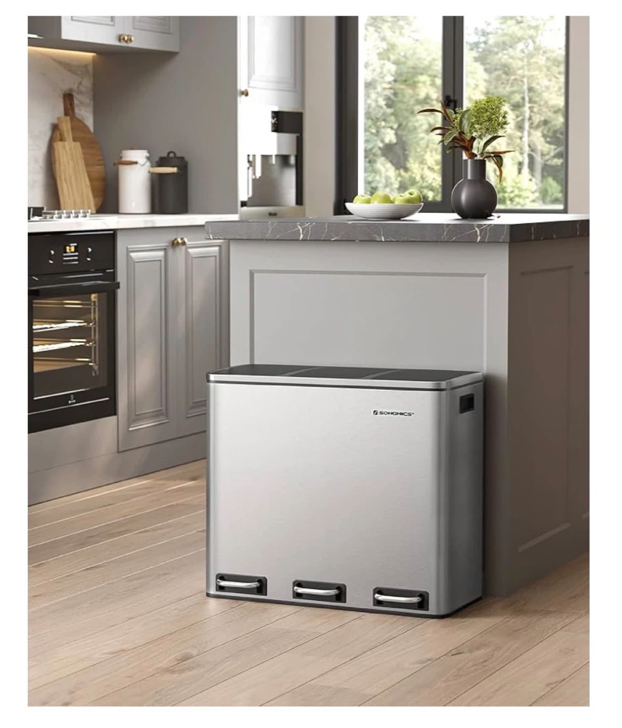 This SONGMICS trash can features three separate compartments for easy sorting. It's made of durable stainless steel with a brushed finish. Each compartment has a soft-close lid operated by a foot pedal. Total capacity is 4.8 gallons (2 bins of 2.4 Gal each).