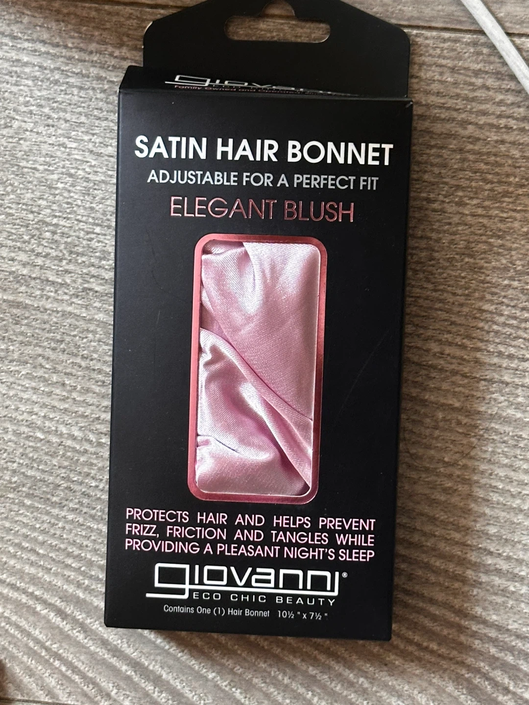 This is a Giovanni satin hair bonnet in Elegant Blush. It's adjustable for a perfect fit and protects hair, preventing frizz and tangles. It's 10.5" x 7.5".