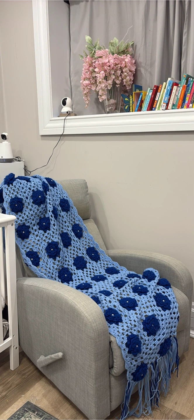 Crochet blanket in light blue. Has darker blue flowers with white pearls. Fringed edges.