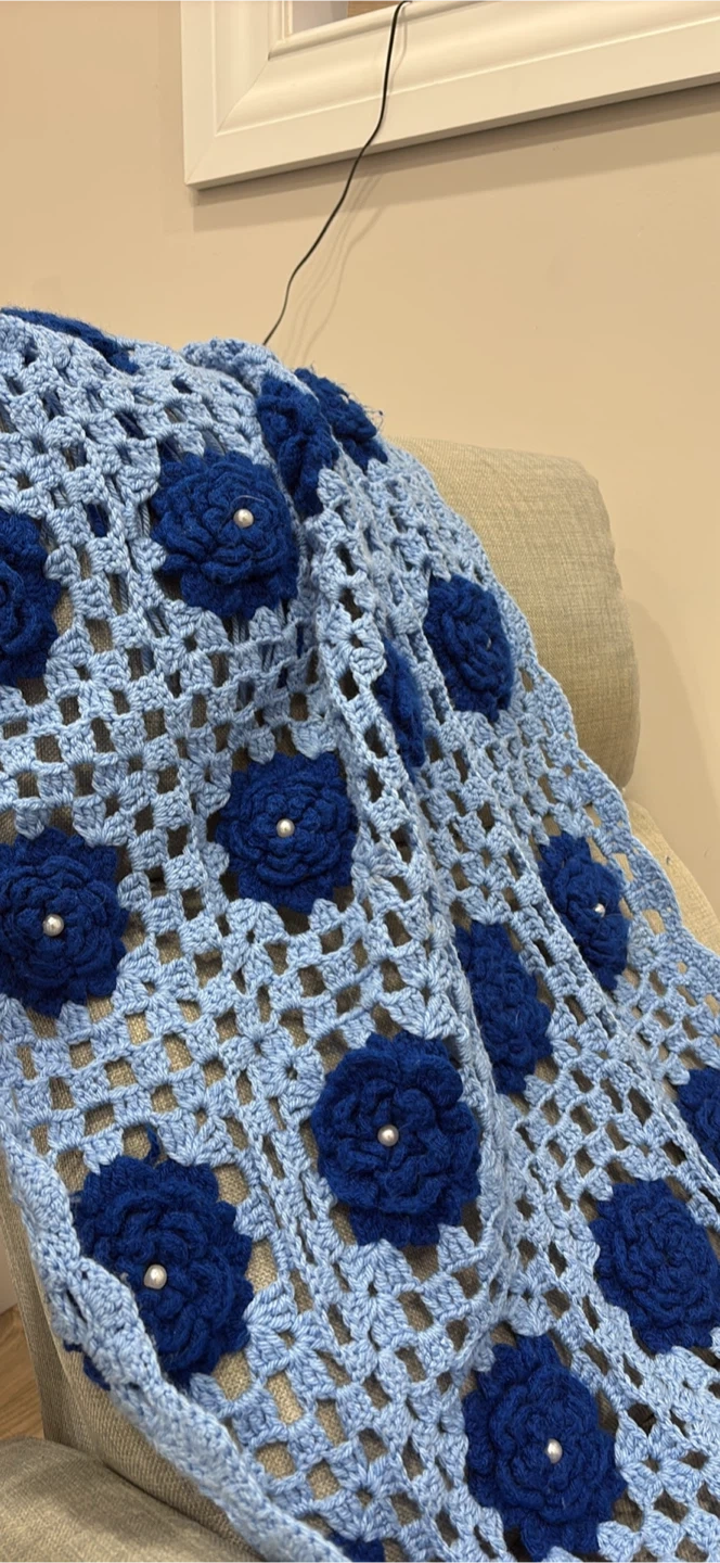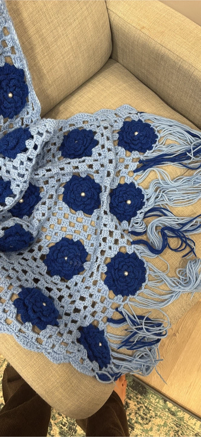 Crochet blanket in light blue. Has darker blue flowers with white pearls. Fringed edges.