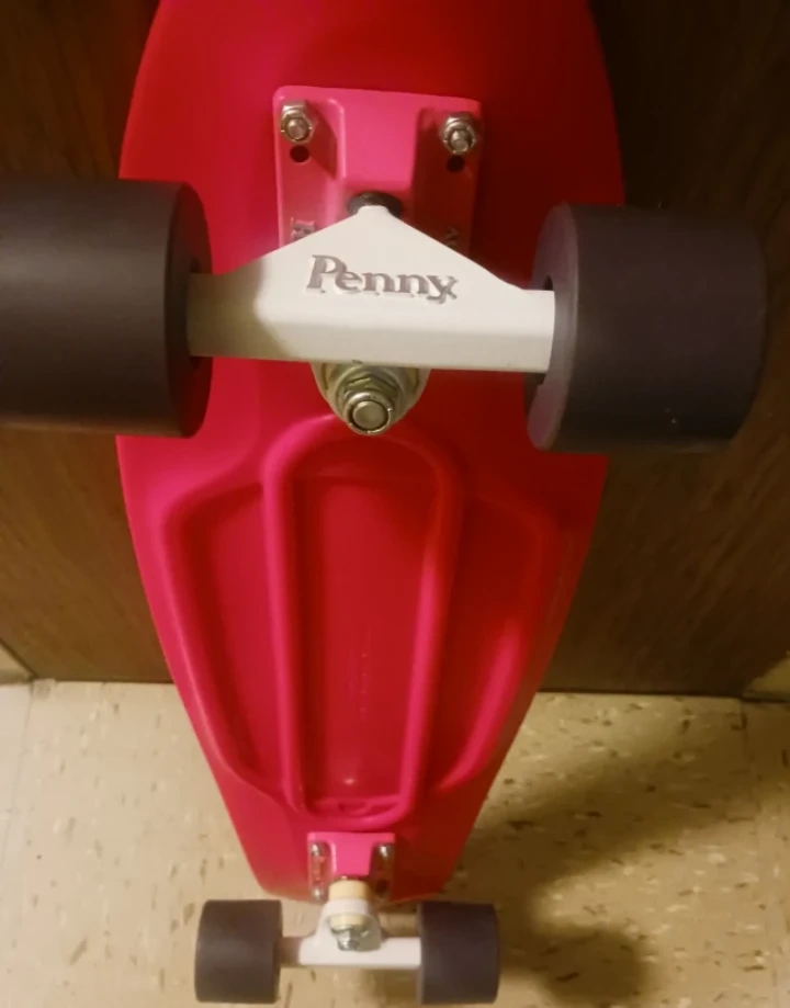 A bright pink Penny Board skateboard. The deck features the Penny logo embossed on the surface. It has white trucks and dark wheels. I put kneecaps and elbow pads with that used board great condition