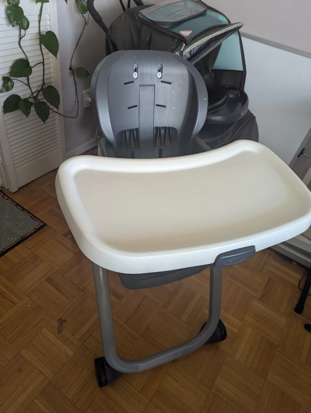 This is a Graco high chair in grey and white. It features a removable tray for easy cleaning. This chair is suitable for feeding babies and toddlers.