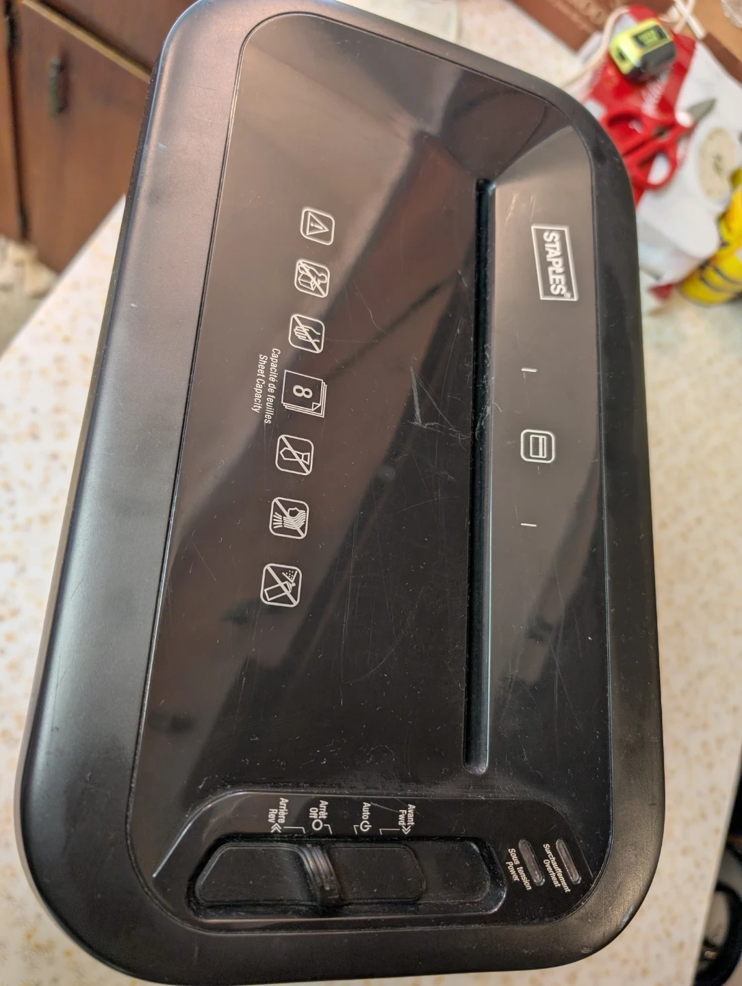 Like new Staples cross-cut shredder for your home office needs. It handles up to 8 sheets at a time. Shredder operates with a corded power supply.