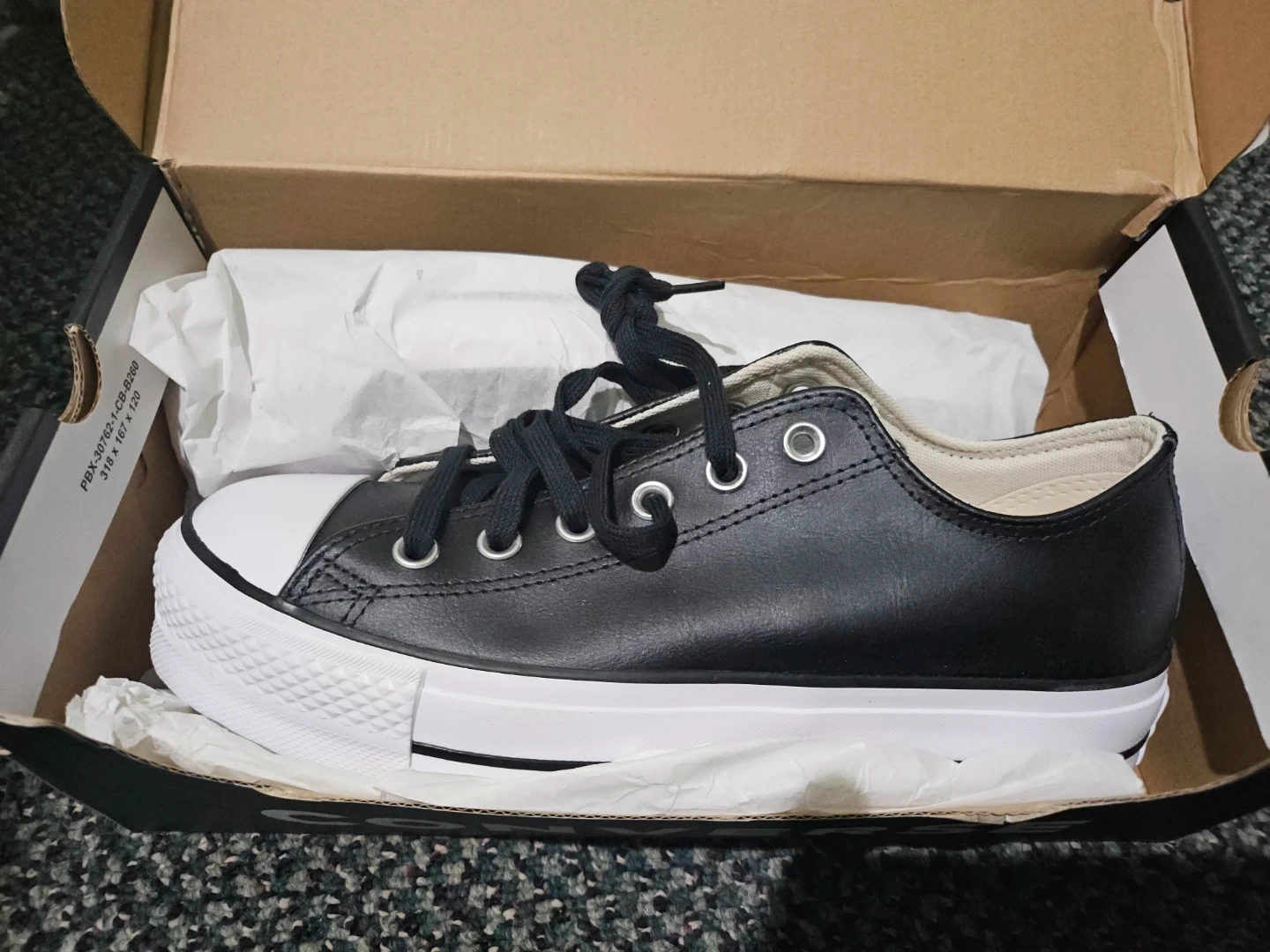 Converse low-top sneaker in black leather. Features All Star logo on the tongue. Black laces and contrasting white logo patch. Timeless casual design.