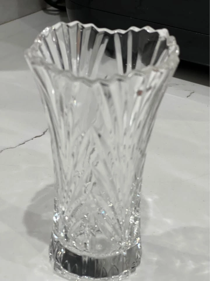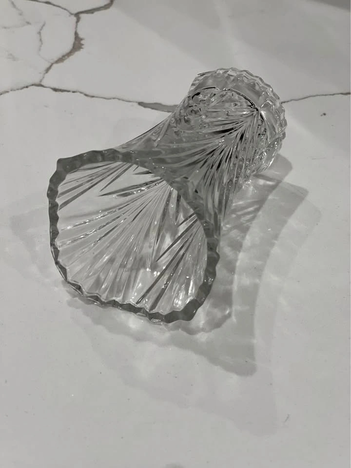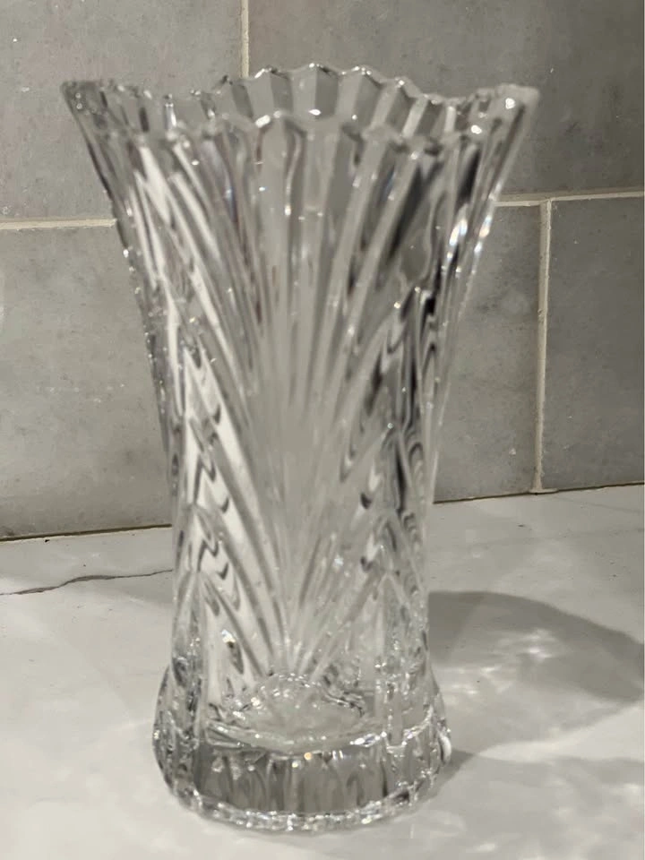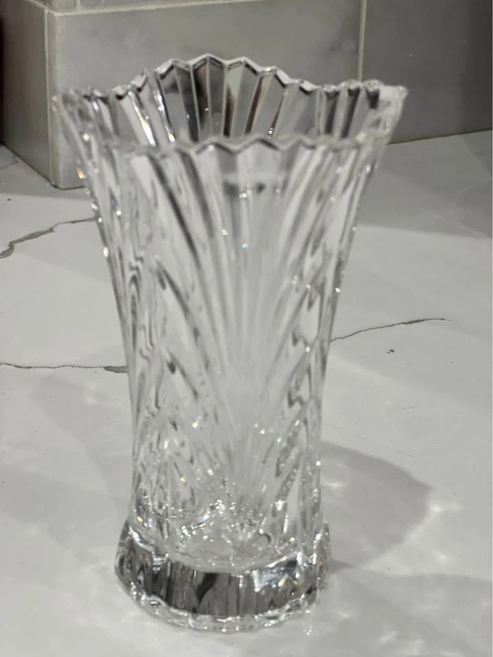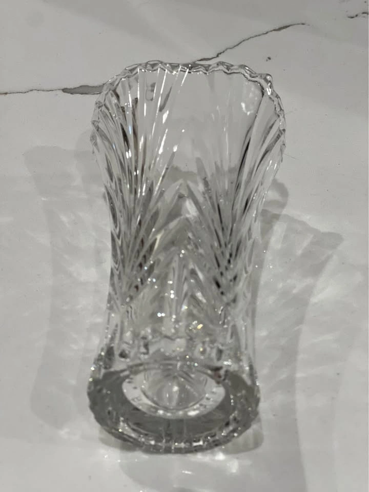 Beautiful Mikasa Accent bud vase, crafted from clear cut crystal. It features a flared, sawtooth-style rim with deep vertical and angular cuts, creating a lovely sparkle and shine. This small vase is in excellent, pre-owned condition with no damage and would make a very nice gift. Part of the "Accent" or "Triad" collections, known for its geometric cut patterns. Crafted in Japan. Measures approximately 4.75 inches tall with a 3" top diameter and 2" bottom diameter. Pickup is at 58th and 7th Ave in midtown Manhattan.