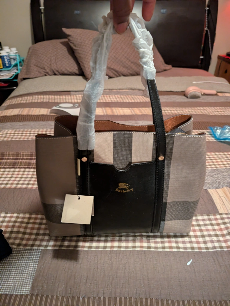 Selling a Burberry tote bag (not sure if it's an original) with a classic plaid pattern.