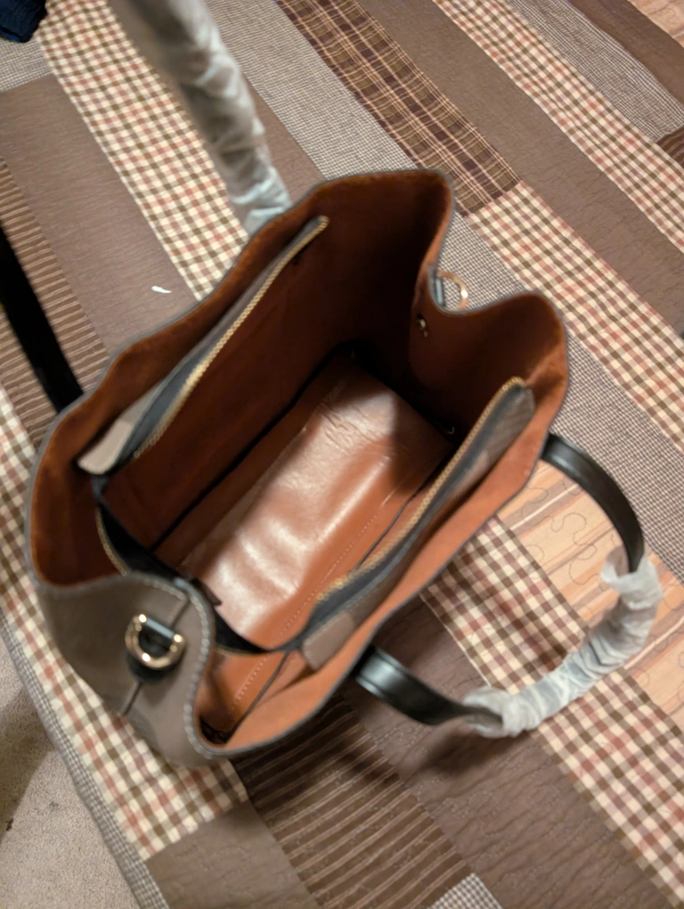 It features black handles and trim, and a spacious interior. Missing the strap