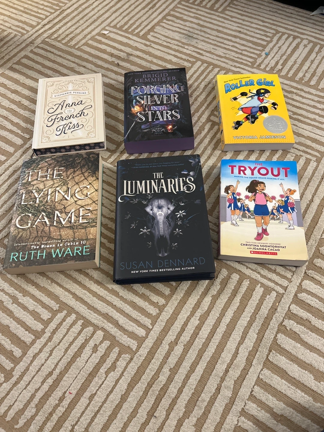 Bundle of 6 young adult fiction books including titles like 'Anna + French Kiss', 'Forging Silver in Stars', 'Roller Girl', 'The Lying Game', 'The Luminaries', and ‘Thr tryout making the squad means risking it all’These books are suitable for teen readers and cover various genres from fantasy to contemporary fiction.