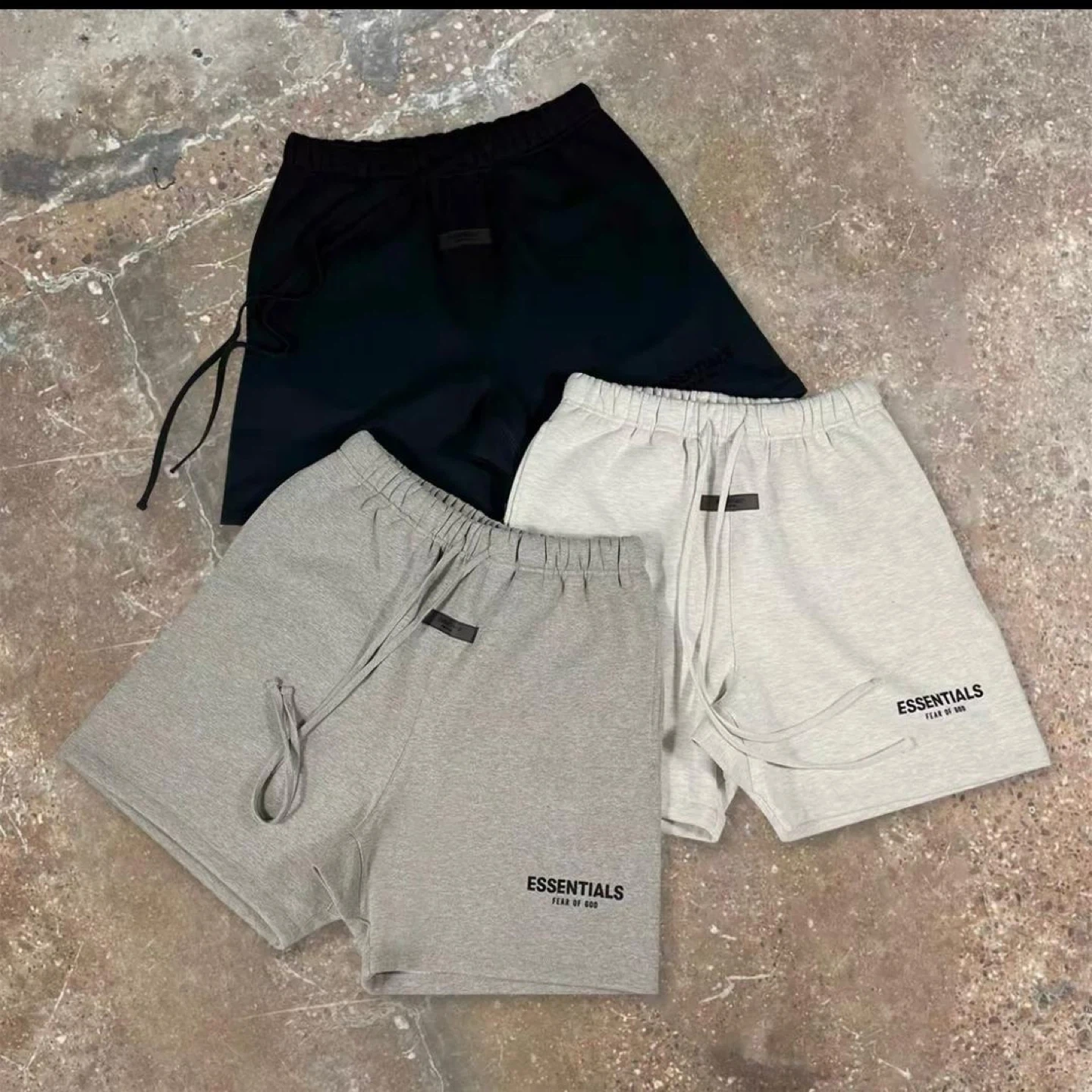 Three Essentials Fear of God t-shirts in black, white, and grey. Also includes three pairs of matching shorts in black, grey, and light grey. Cotton blend material. Great for casual wear!