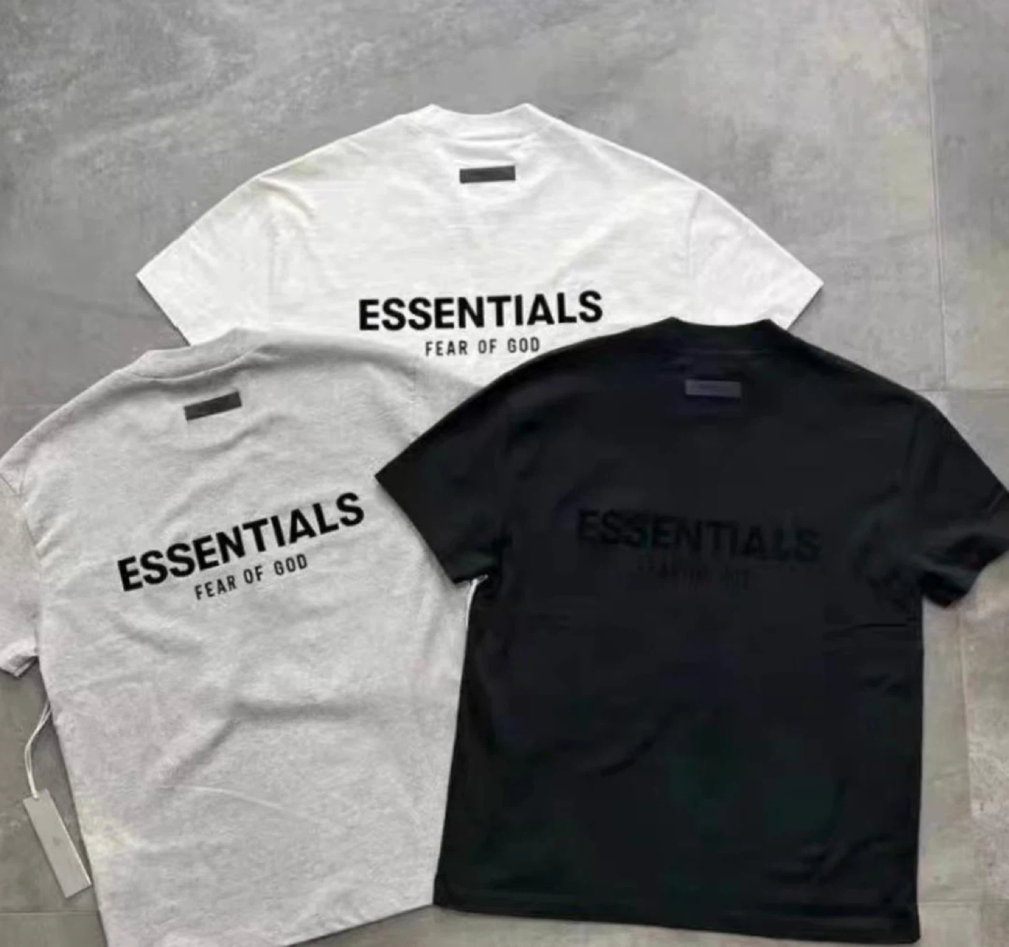 Three Essentials Fear of God t-shirts in black, white, and grey. Also includes three pairs of matching shorts in black, grey, and light grey. Cotton blend material. Great for casual wear!