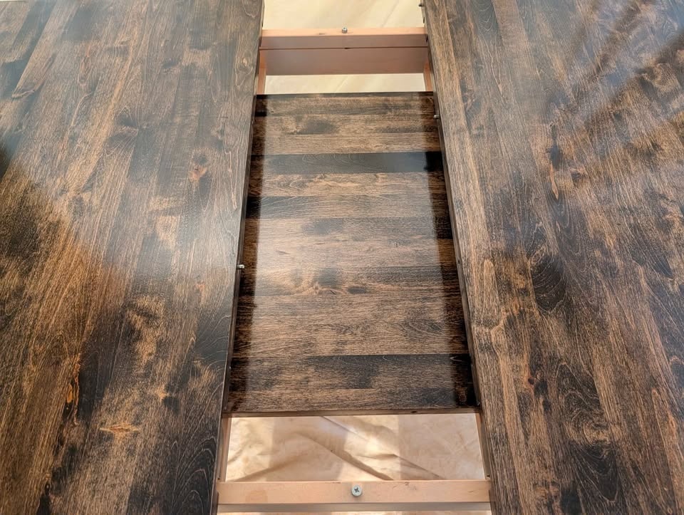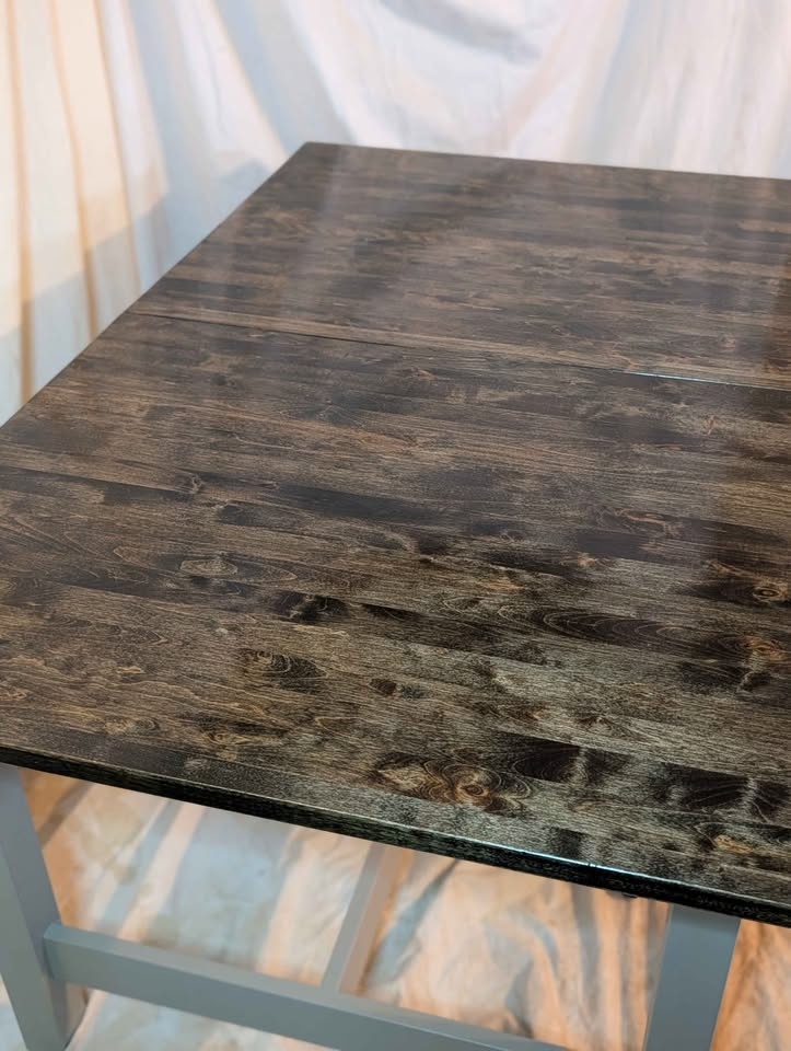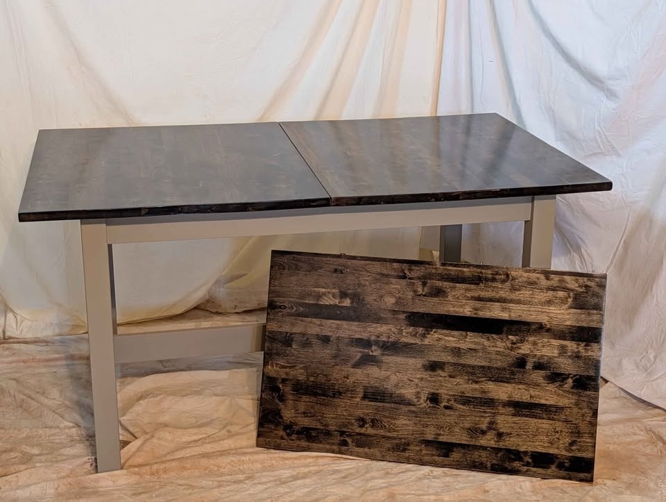 You won't find this stain color in stores; it doesn't exist! Made by me, it's one of a kind with a nice gray base. Dimensions are 3 ft by 5 ft, and the leaf is an extra 21 in. The leaf stores inside when not in use for a handy addition. The color pops and changes as you move in the light. Don't miss this opportunity – no one else has one of these!